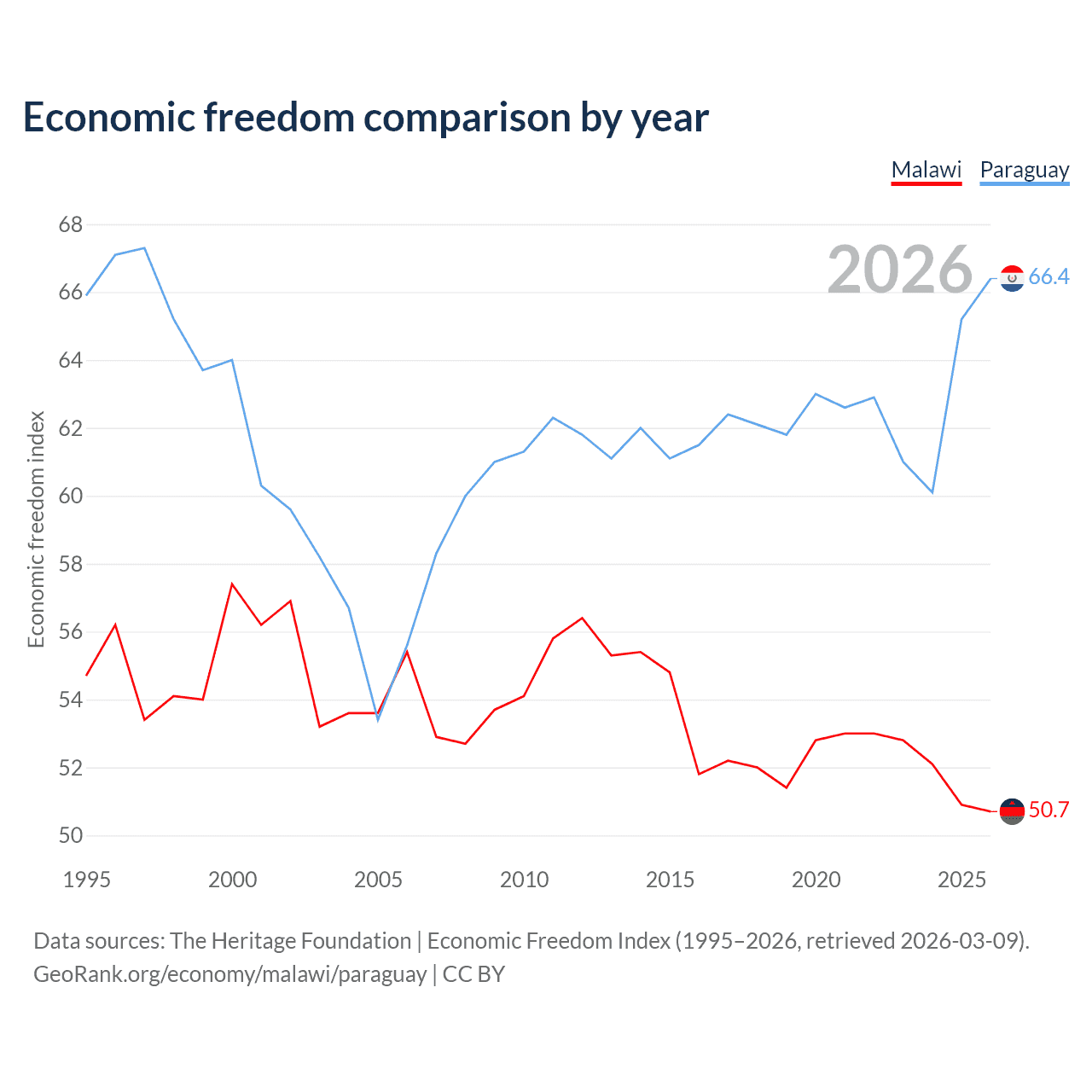 The Economic Freedom Index for Malawi is 50.7, ranking 159/197, compared to 66.4 for Paraguay, ranking 61/197. The chart above displays a comparison of annual changes in economic freedom indexes.
