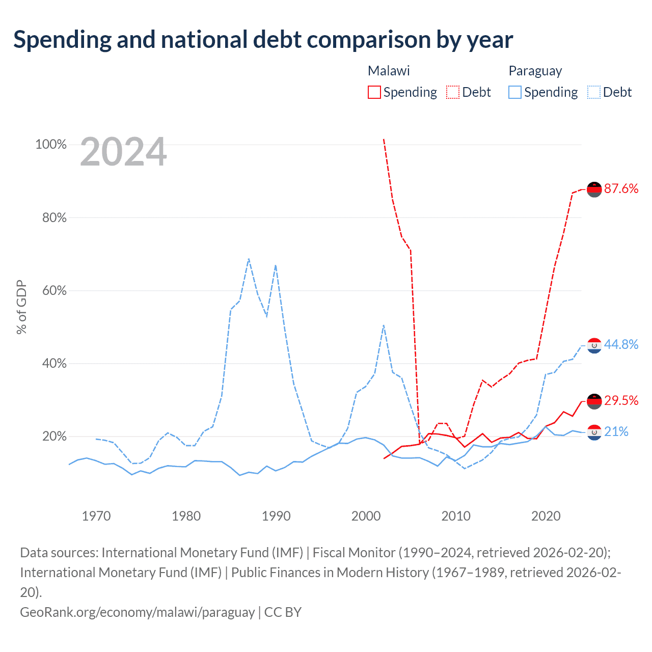 Malawi has $9.91B in government debt (87.6% of GDP), compared to $19.9B (44.8% of GDP) in Paraguay.