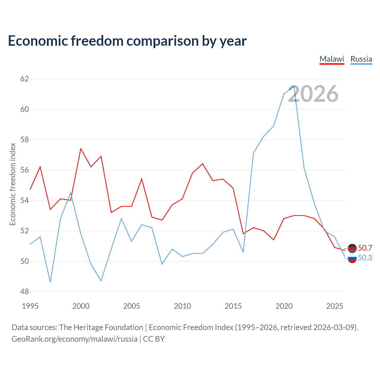 The Economic Freedom Index for Malawi is 50.7, ranking 159/197, compared to 50.3 for Russia, ranking 161/197. The chart above displays a comparison of annual changes in economic freedom indexes.