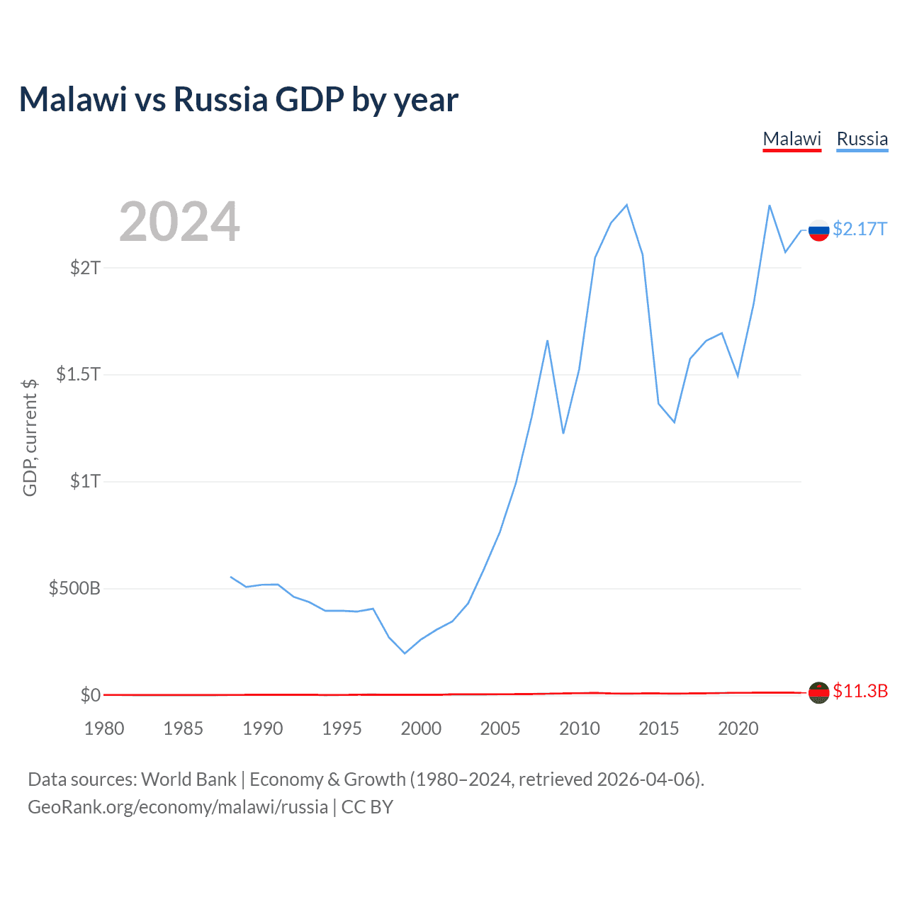 Malawi has a GDP of $11.3B compared to $2.17T for Russia, ranking 151/197 and 11/197 by economy size, respectively.