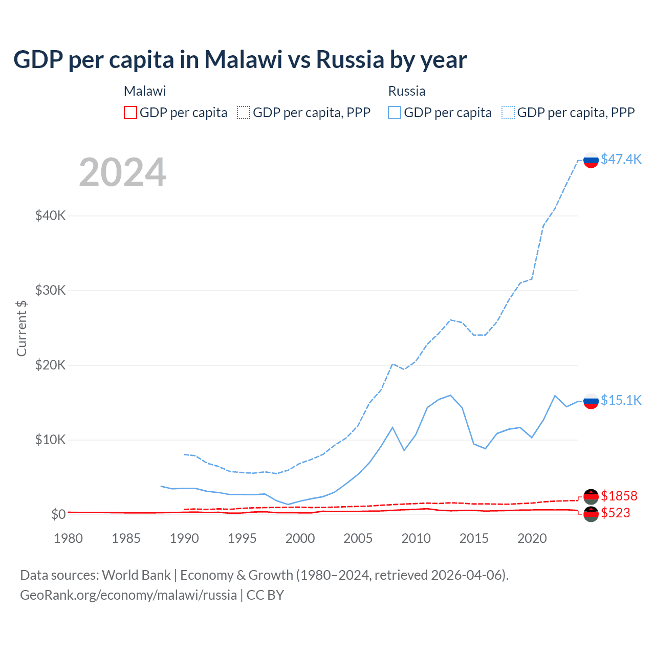 GDP per capita in Malawi vs Russia by year