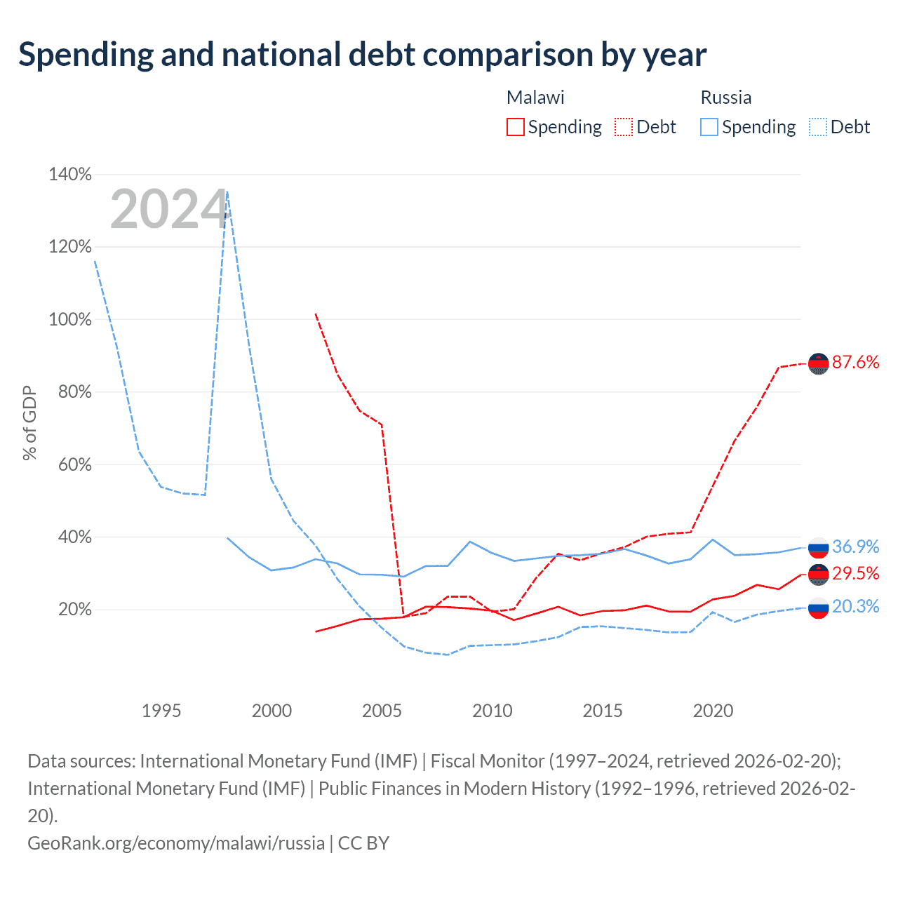 Malawi has $9.91B in government debt (87.6% of GDP), compared to $440B (20.3% of GDP) in Russia.