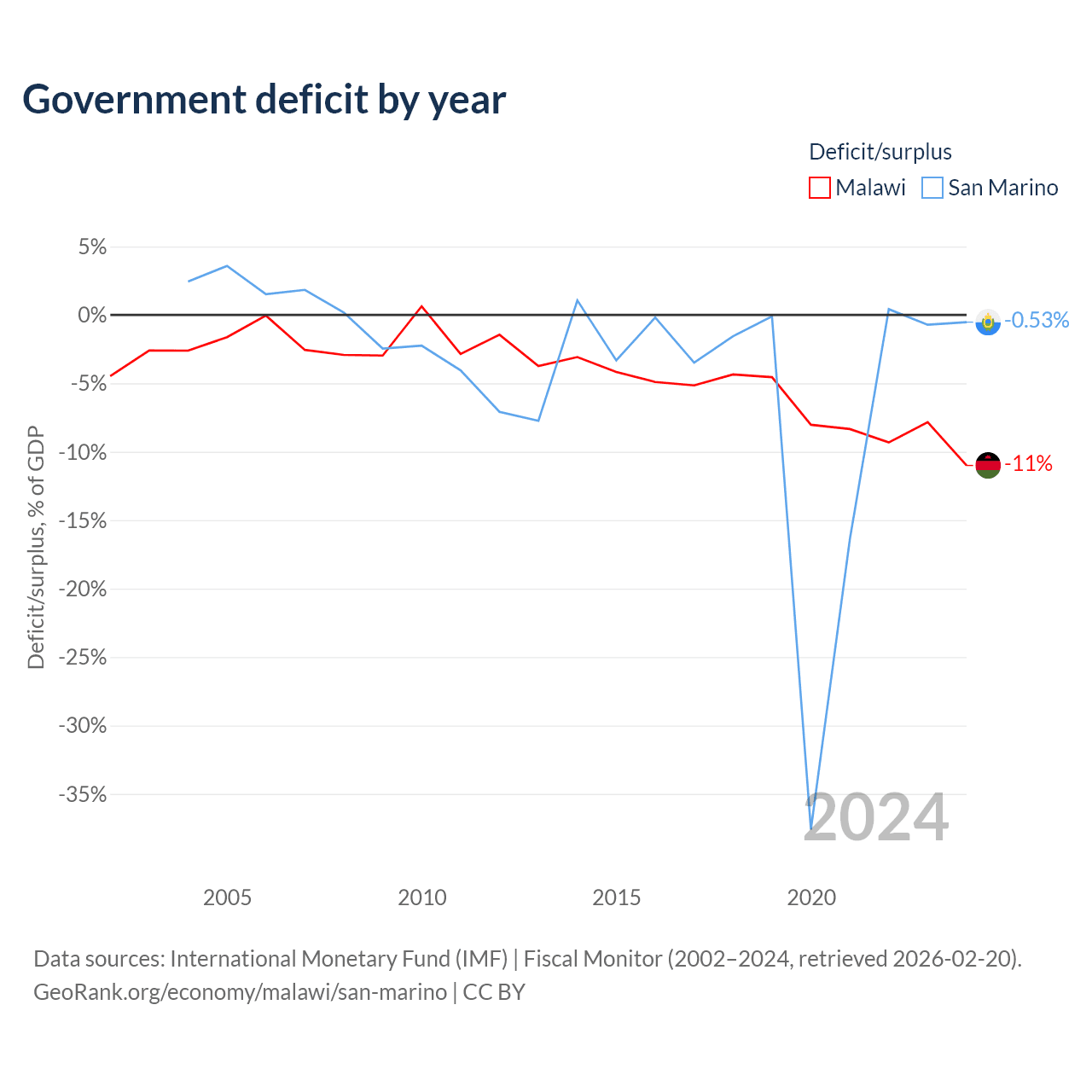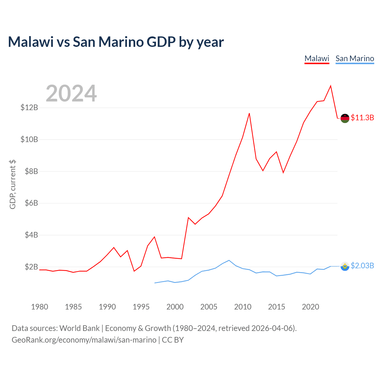 Malawi has a GDP of $11.3B compared to $2.03B for San Marino, ranking 151/197 and 180/197 by economy size, respectively.