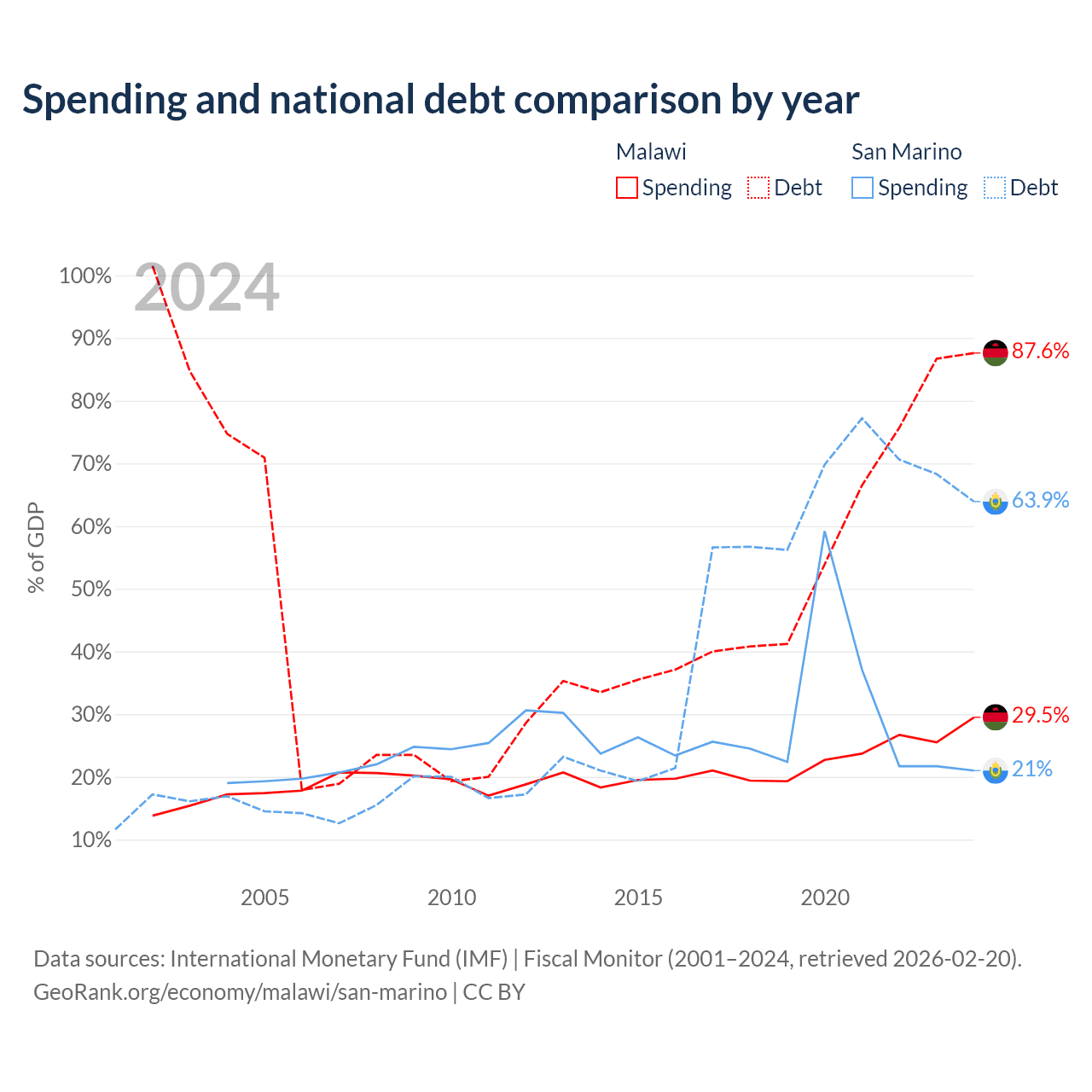 Malawi has $9.91B in government debt (87.6% of GDP), compared to $1.39B (63.9% of GDP) in San Marino.
