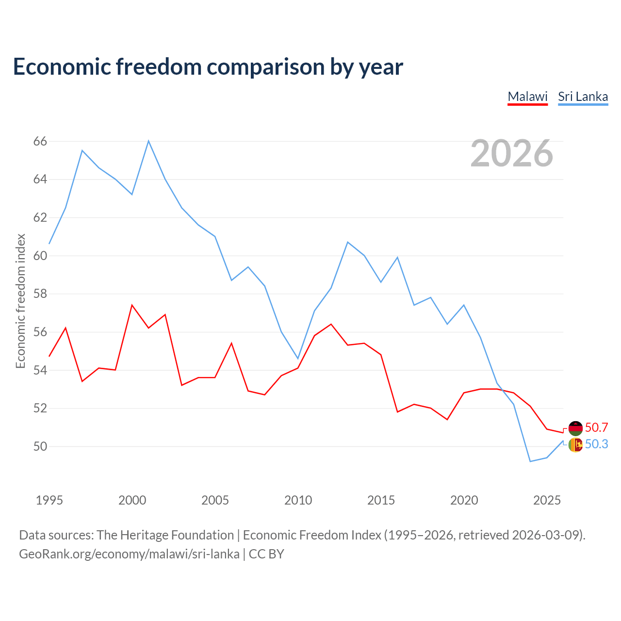 The Economic Freedom Index for Malawi is 50.7, ranking 159/197, compared to 50.3 for Sri Lanka, ranking 162/197. The chart above displays a comparison of annual changes in economic freedom indexes.