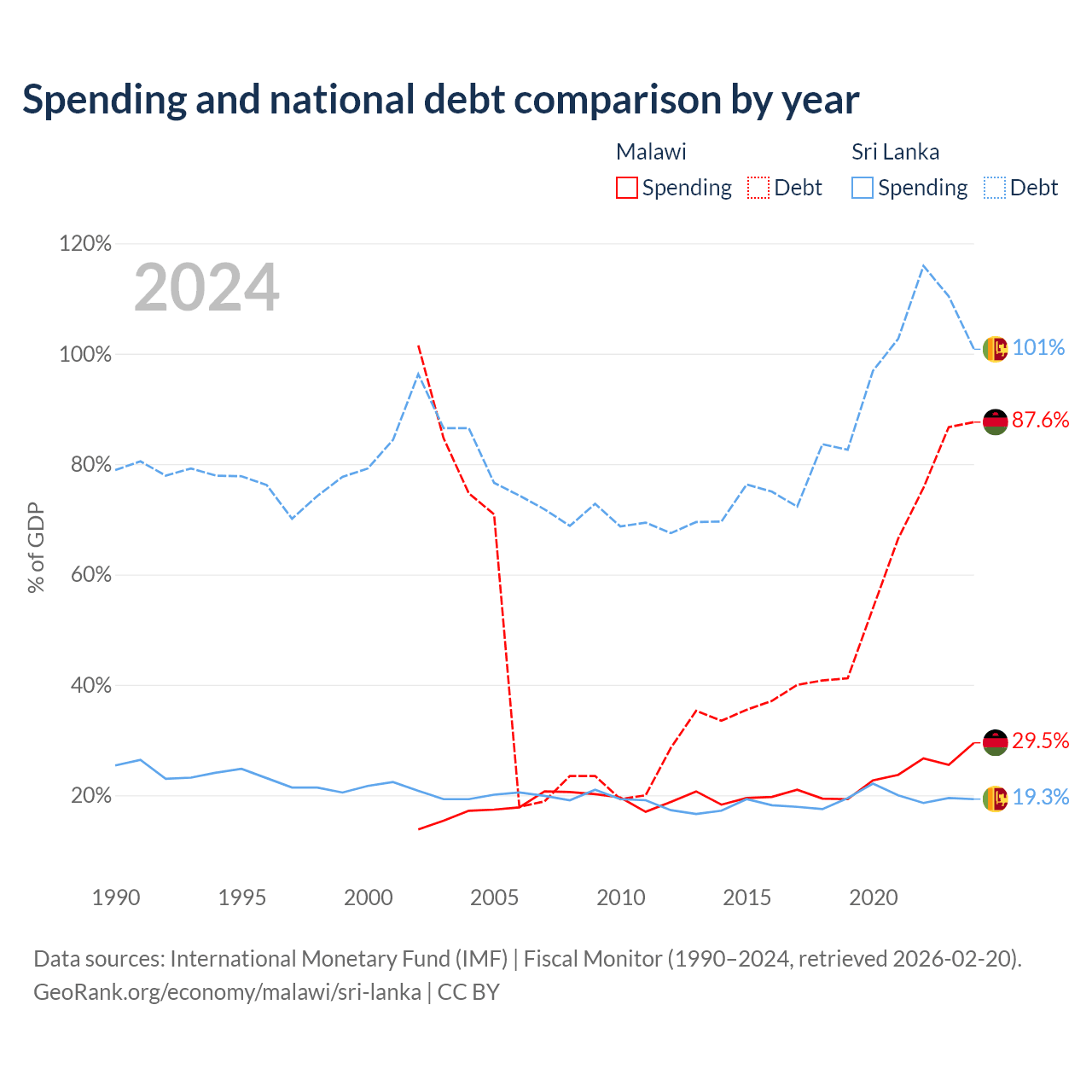 Malawi has $9.91B in government debt (87.6% of GDP), compared to $99.8B (100.8% of GDP) in Sri Lanka.
