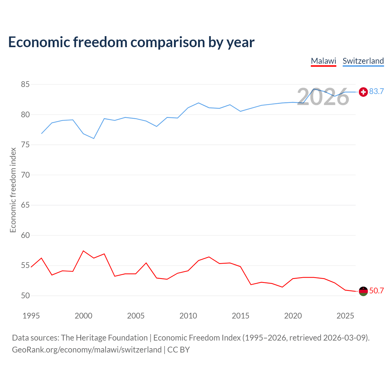 The Economic Freedom Index for Malawi is 50.7, ranking 159/197, compared to 83.7 for Switzerland, ranking 2/197. The chart above displays a comparison of annual changes in economic freedom indexes.