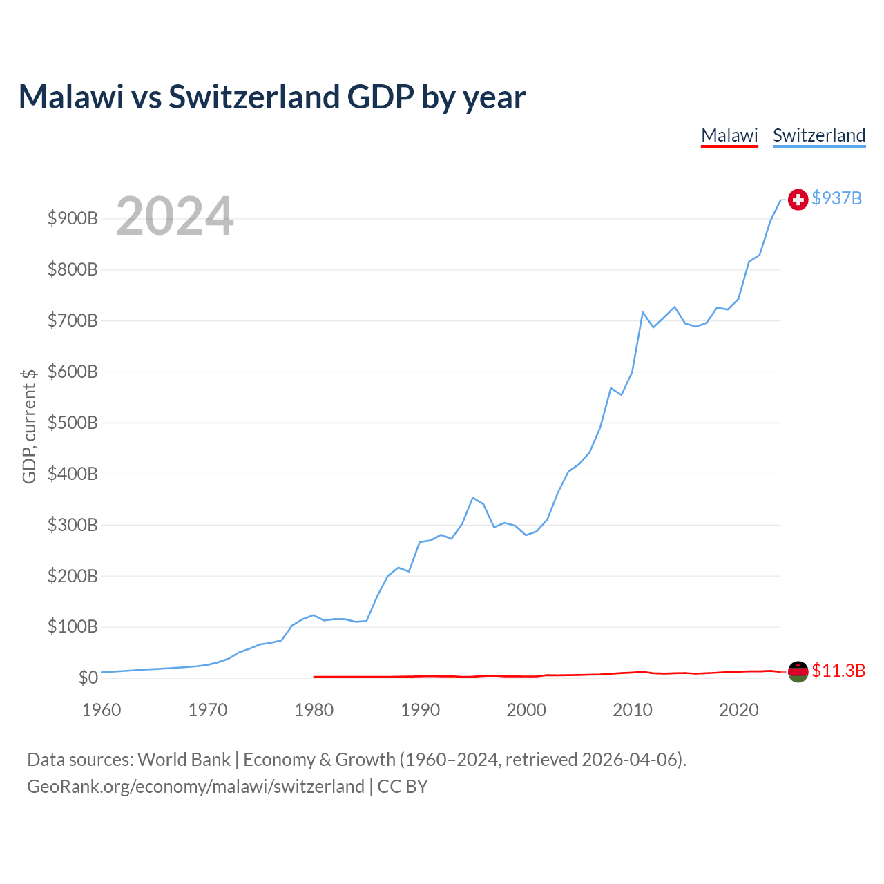 Malawi has a GDP of $11.3B compared to $937B for Switzerland, ranking 151/197 and 20/197 by economy size, respectively.