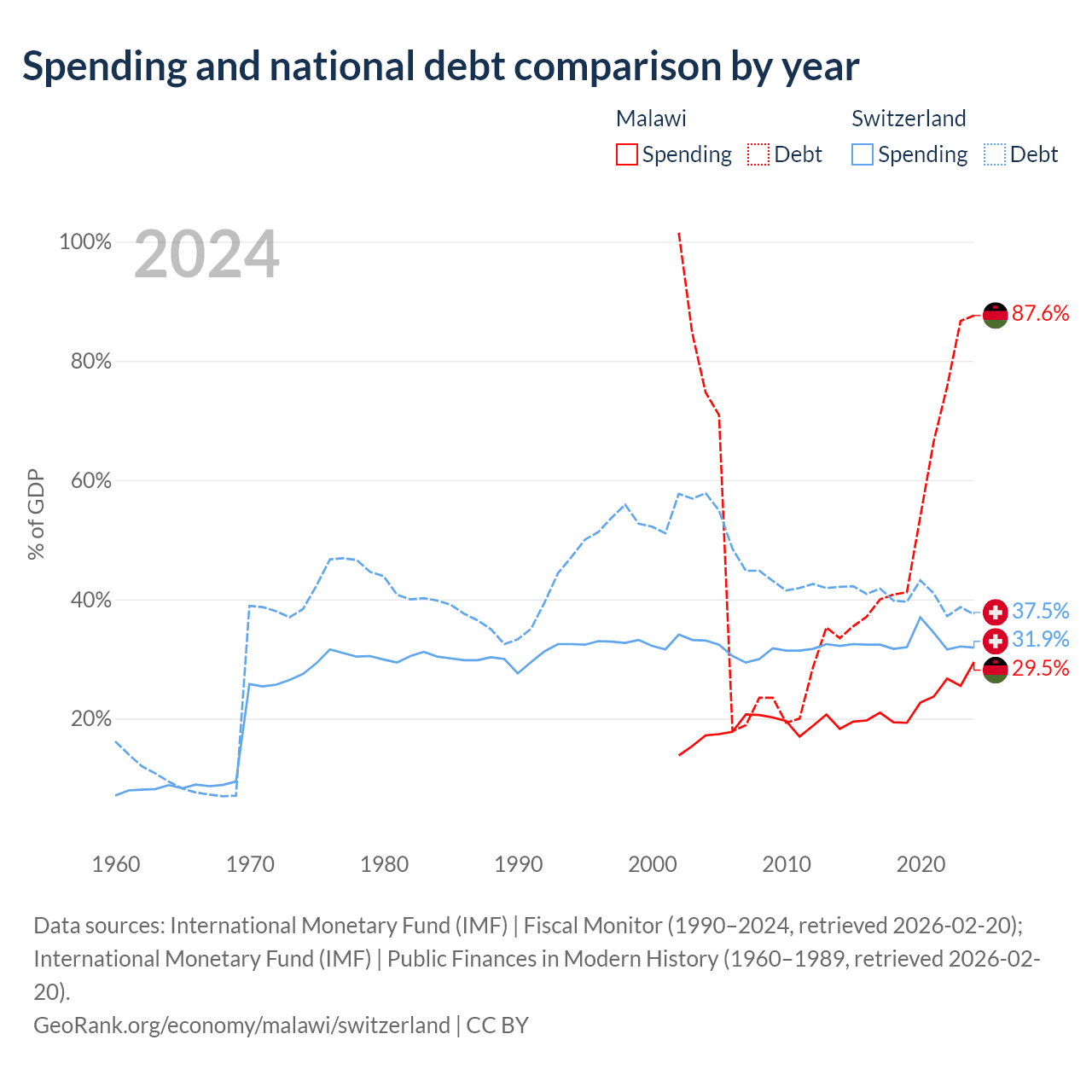Malawi has $9.91B in government debt (87.6% of GDP), compared to $351B (37.5% of GDP) in Switzerland.
