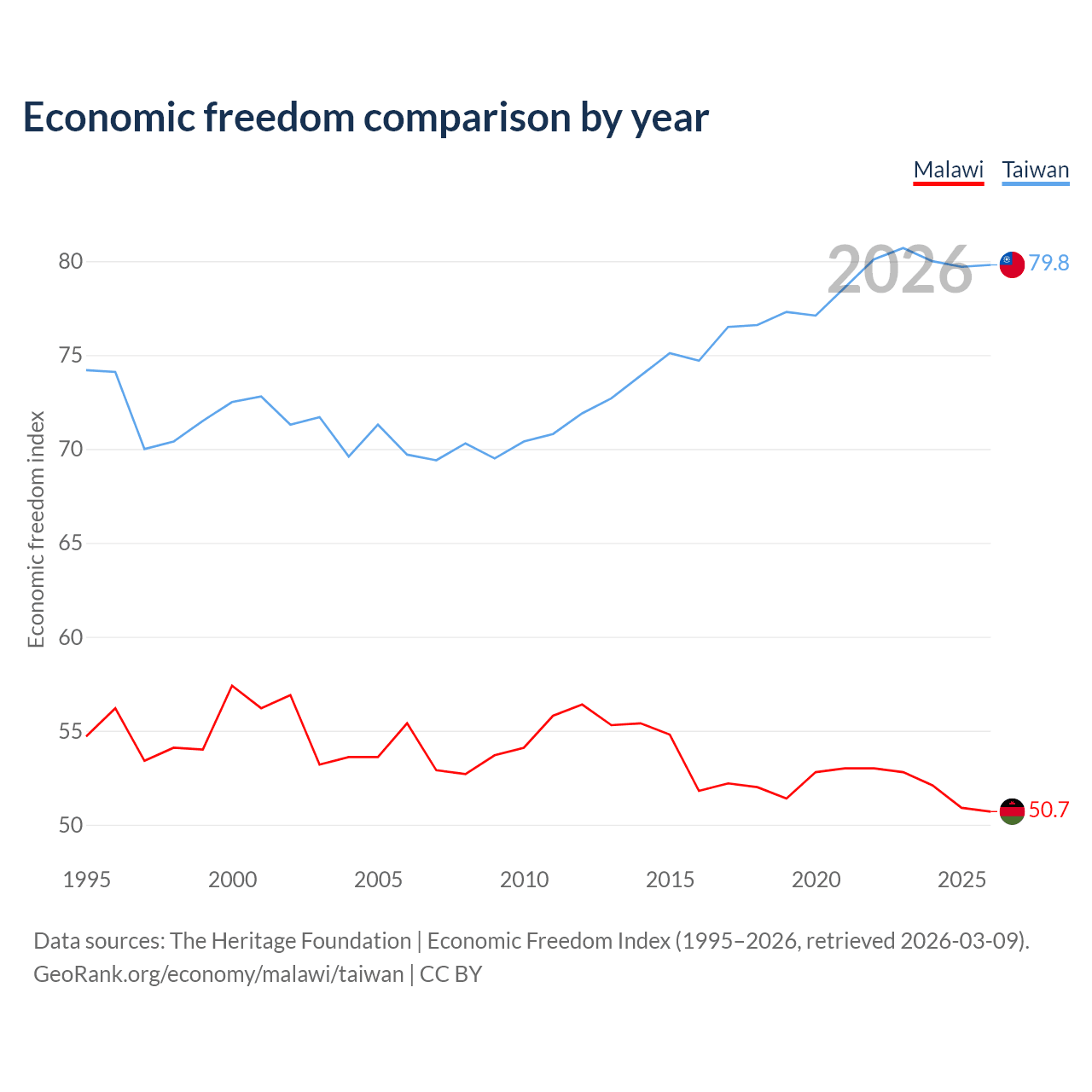 The Economic Freedom Index for Malawi is 50.7, ranking 159/197, compared to 79.8 for Taiwan, ranking 6/197. The chart above displays a comparison of annual changes in economic freedom indexes.