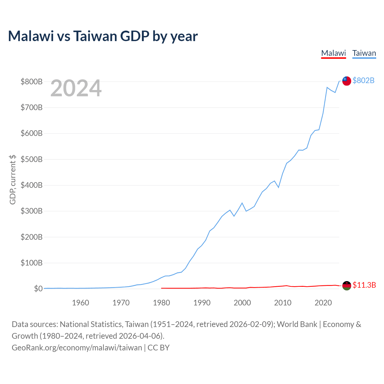 Malawi vs Taiwan GDP by year