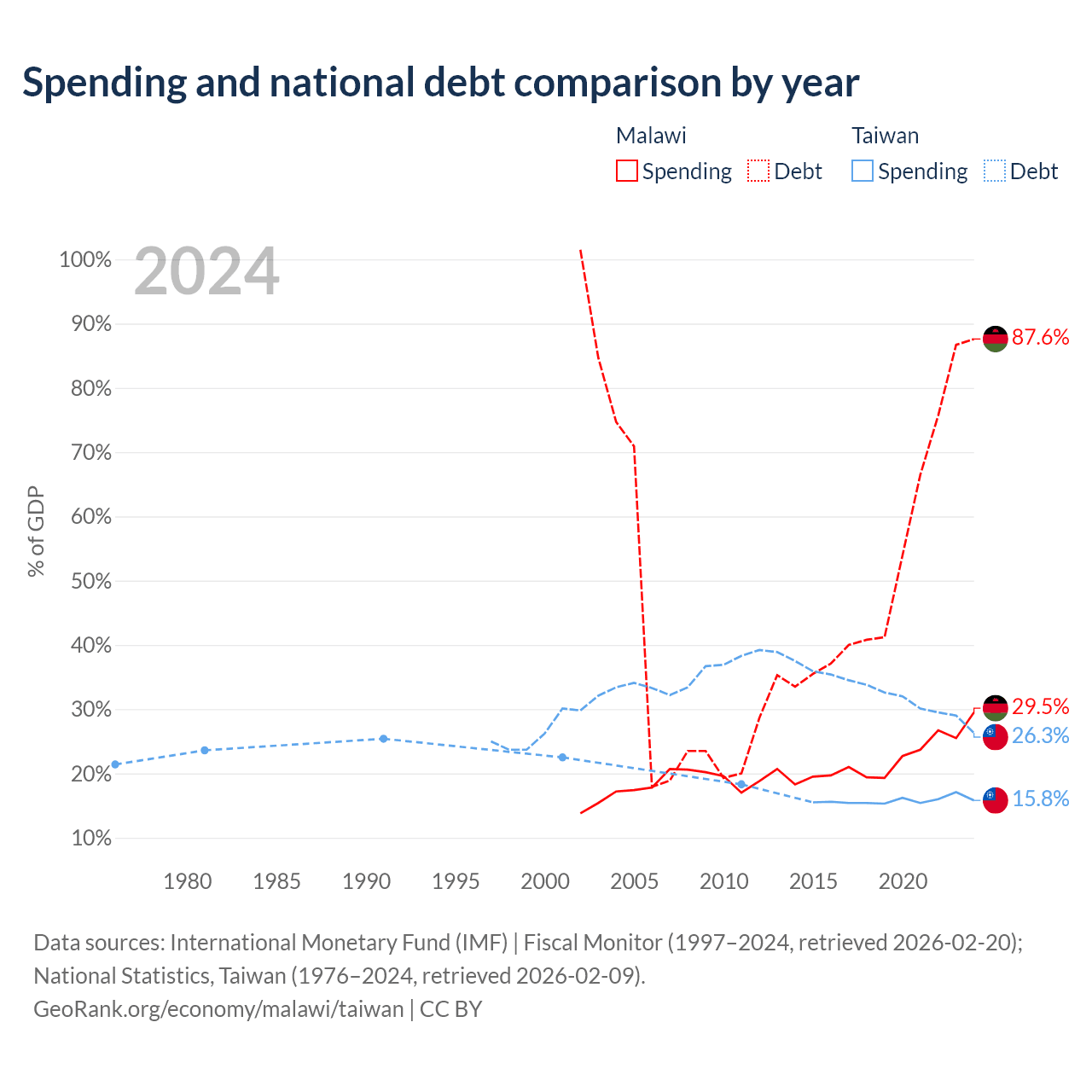Malawi has $9.91B in government debt (87.6% of GDP), compared to $211B (26.3% of GDP) in Taiwan.