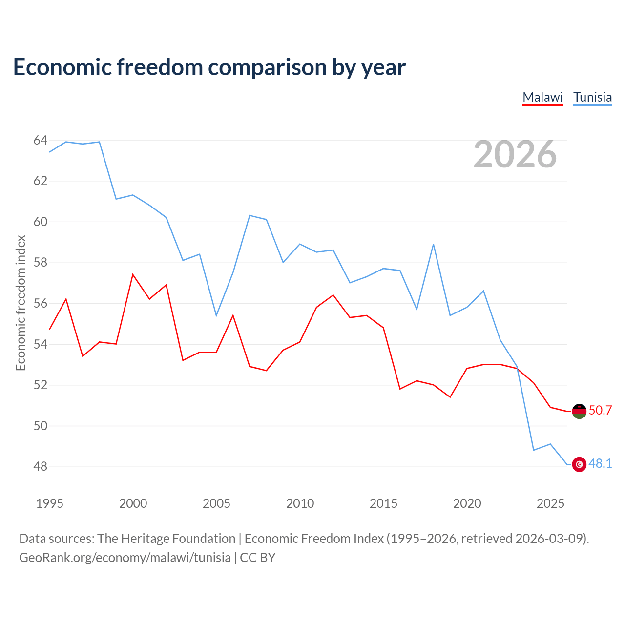 Data sources: The Heritage Foundation | Economic Freedom Index (1995–2026, retrieved 2026-03-09).