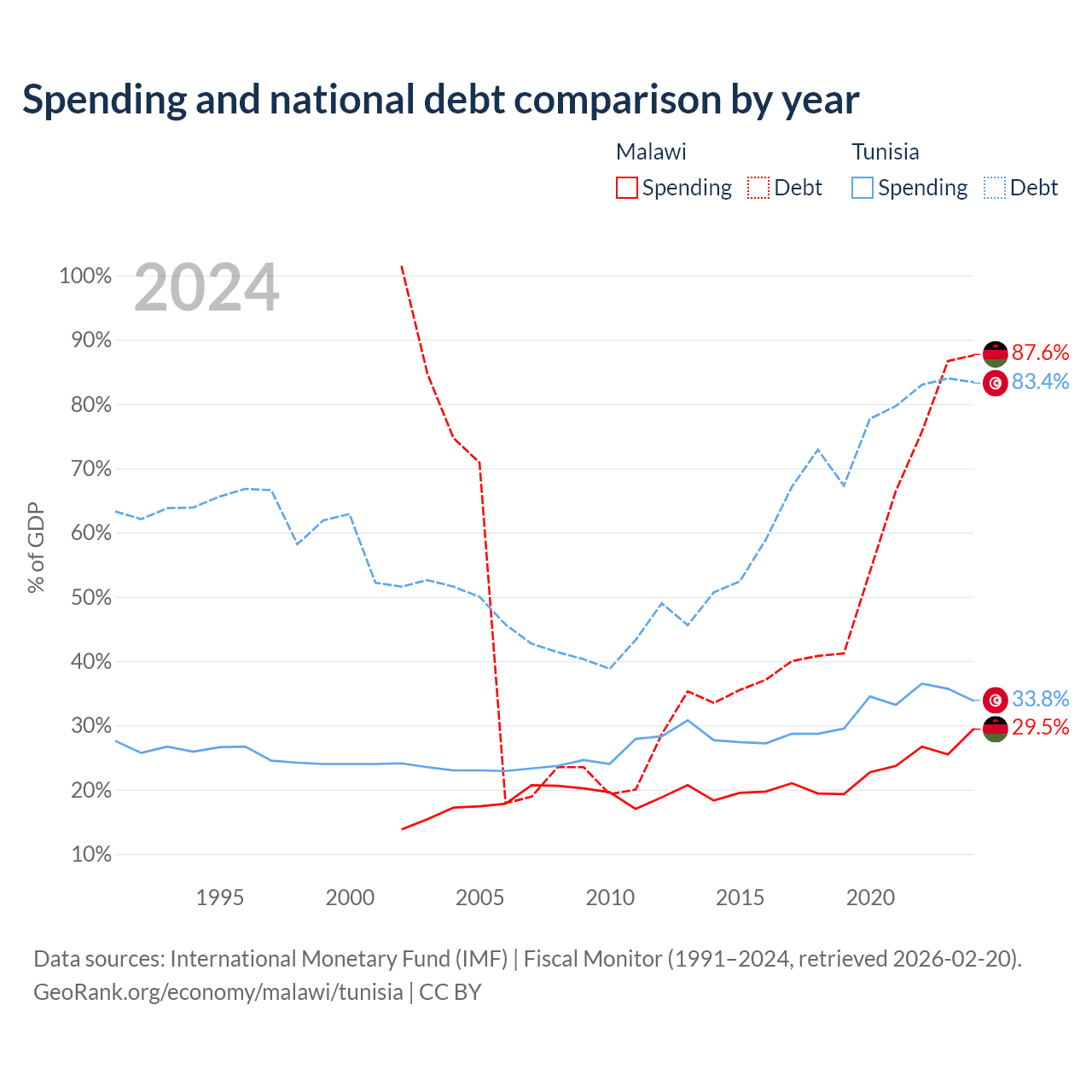 Malawi has $9.91B in government debt (87.6% of GDP), compared to $42.8B (83.4% of GDP) in Tunisia.