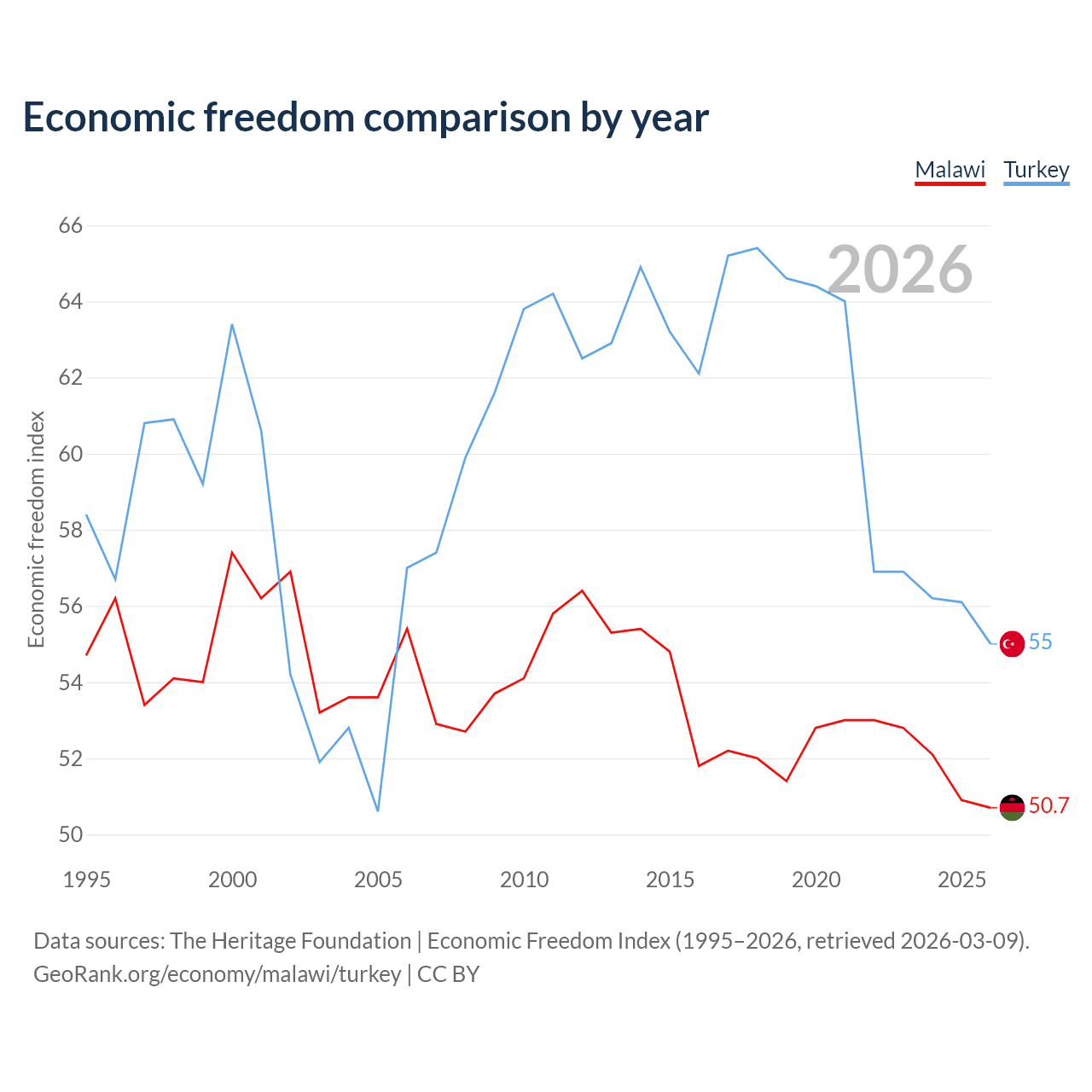 The Economic Freedom Index for Malawi is 50.7, ranking 159/197, compared to 55 for Turkey, ranking 129/197. The chart above displays a comparison of annual changes in economic freedom indexes.