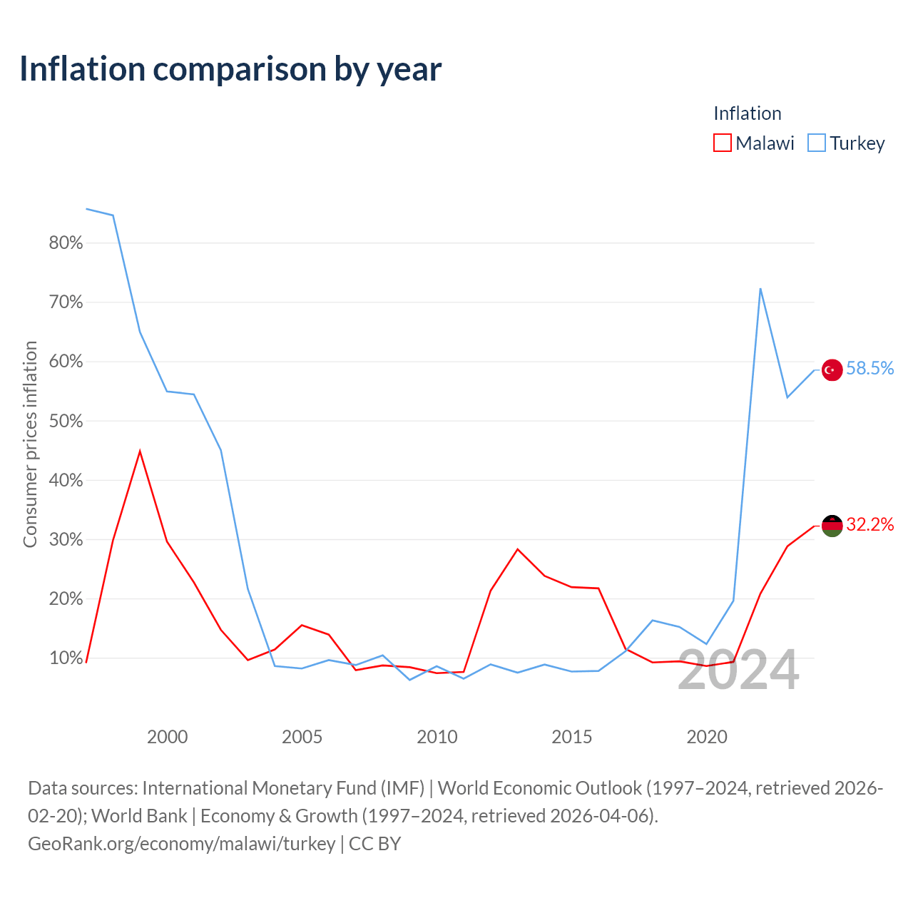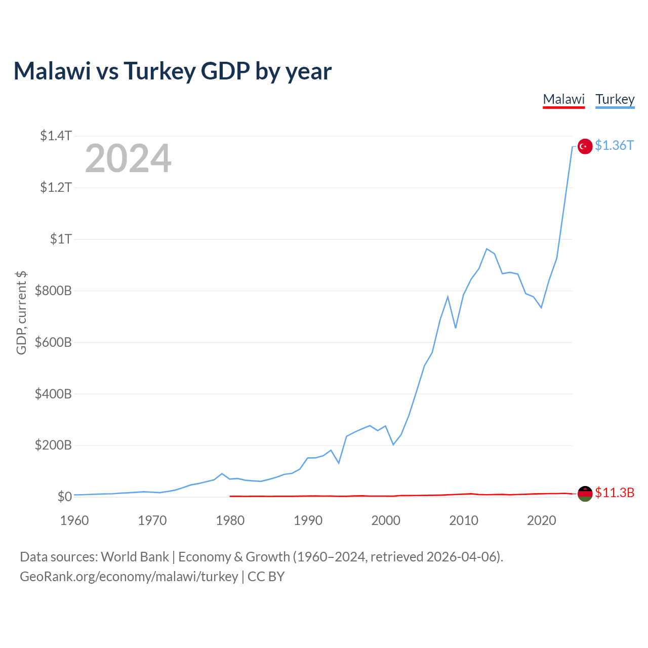 Malawi has a GDP of $11.3B compared to $1.36T for Turkey, ranking 151/197 and 17/197 by economy size, respectively.