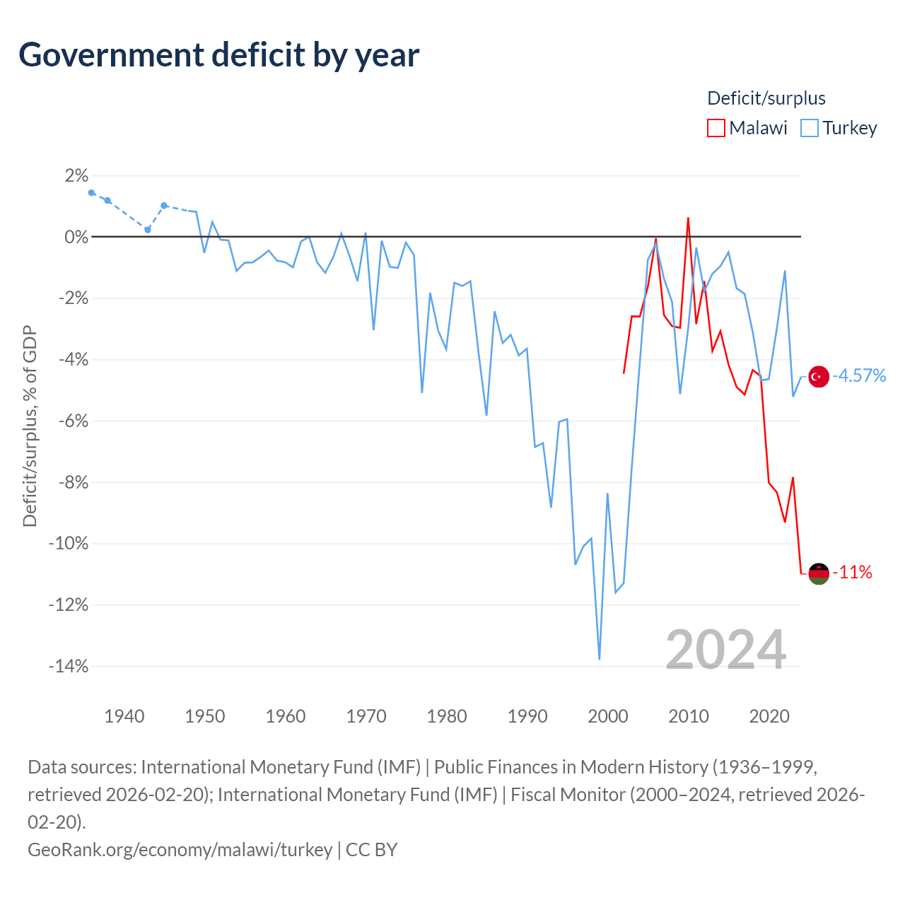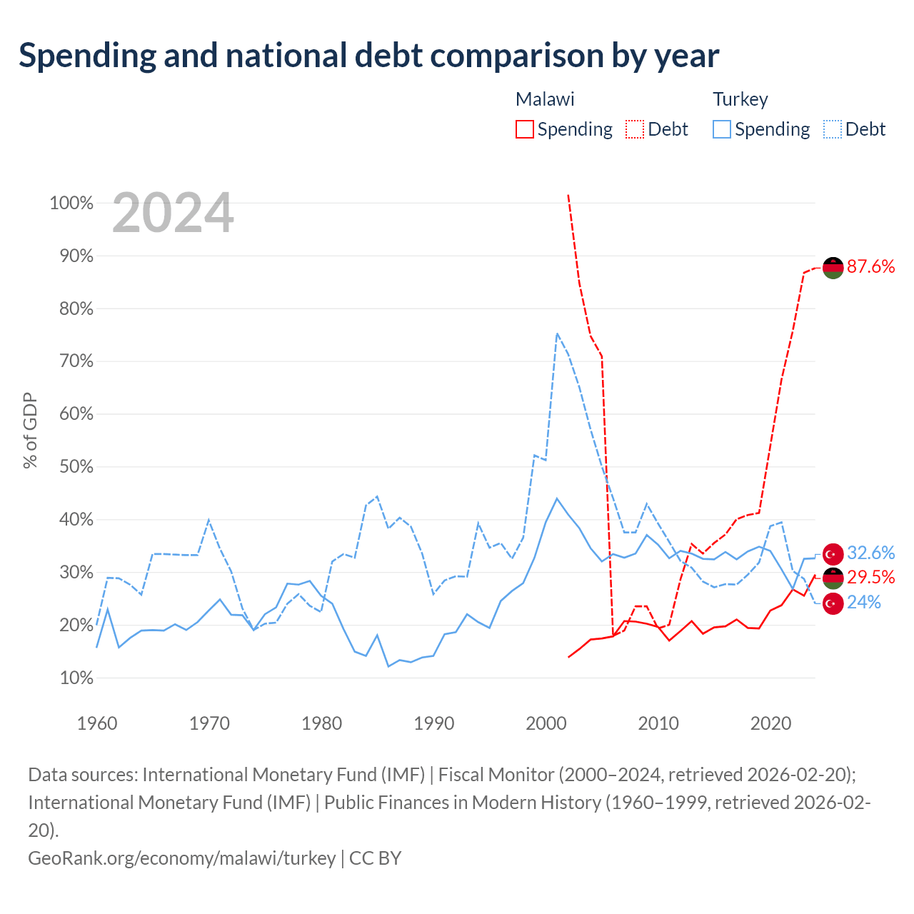 Malawi has $9.91B in government debt (87.6% of GDP), compared to $327B (24% of GDP) in Turkey.