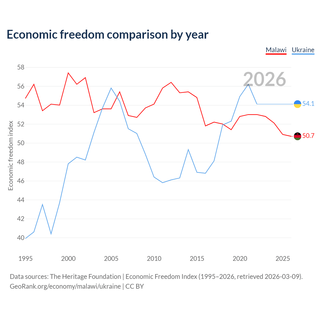 The Economic Freedom Index for Malawi is 50.7, ranking 159/197, compared to 54.1 for Ukraine, ranking 135/197. The chart above displays a comparison of annual changes in economic freedom indexes.