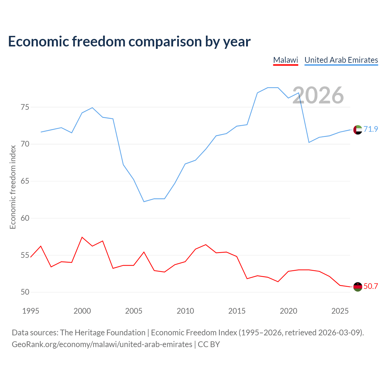 The Economic Freedom Index for Malawi is 50.7, ranking 159/197, compared to 71.9 for the United Arab Emirates, ranking 29/197. The chart above displays a comparison of annual changes in economic freedom indexes.