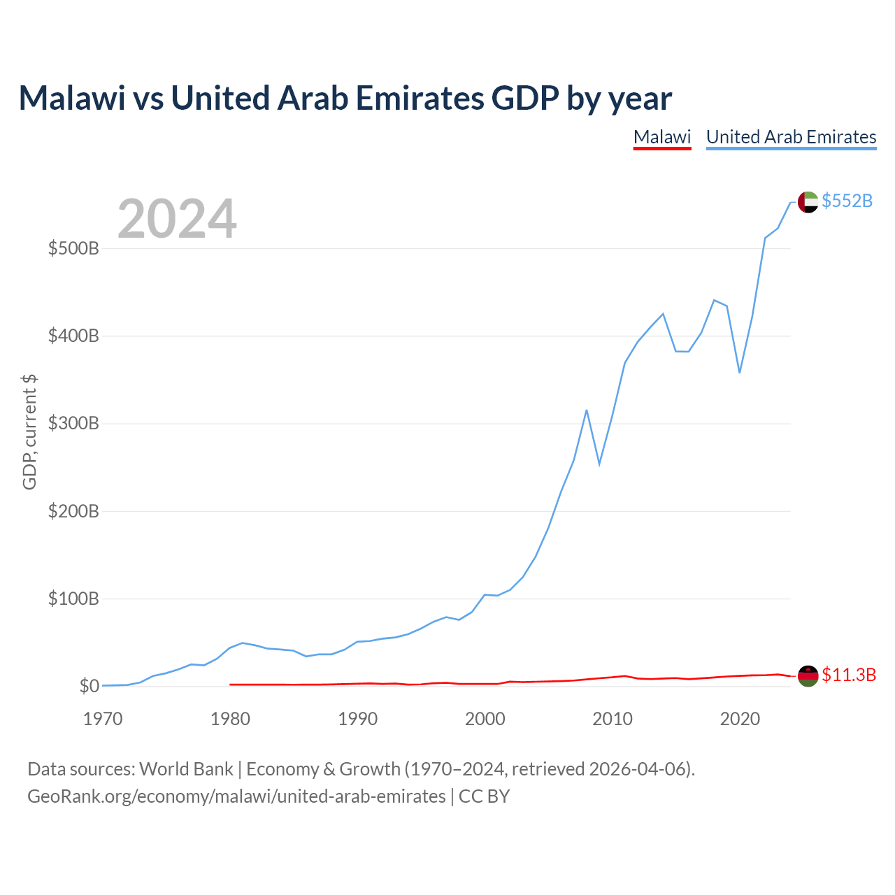 Malawi has a GDP of $11.3B compared to $552B for the United Arab Emirates, ranking 151/197 and 27/197 by economy size, respectively.