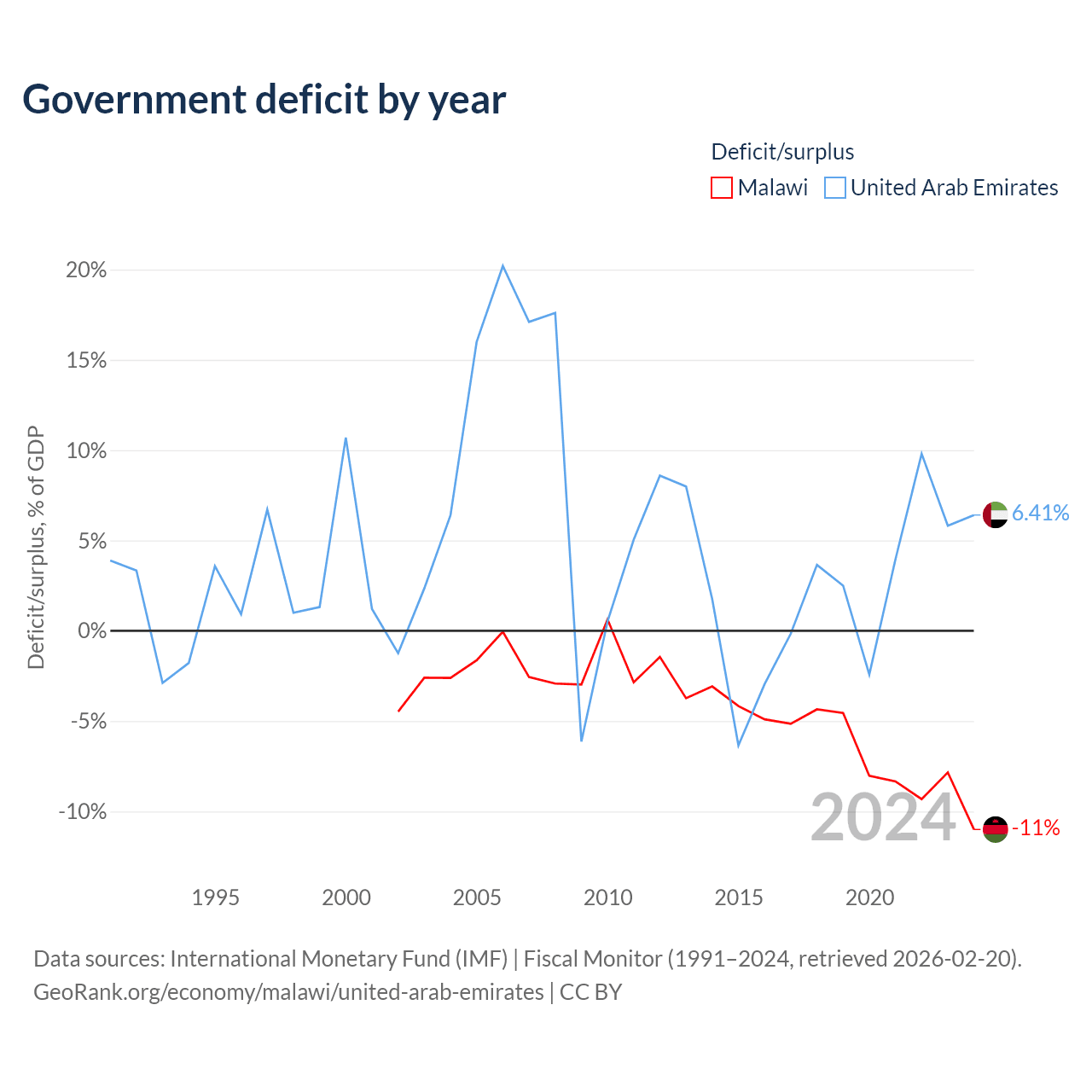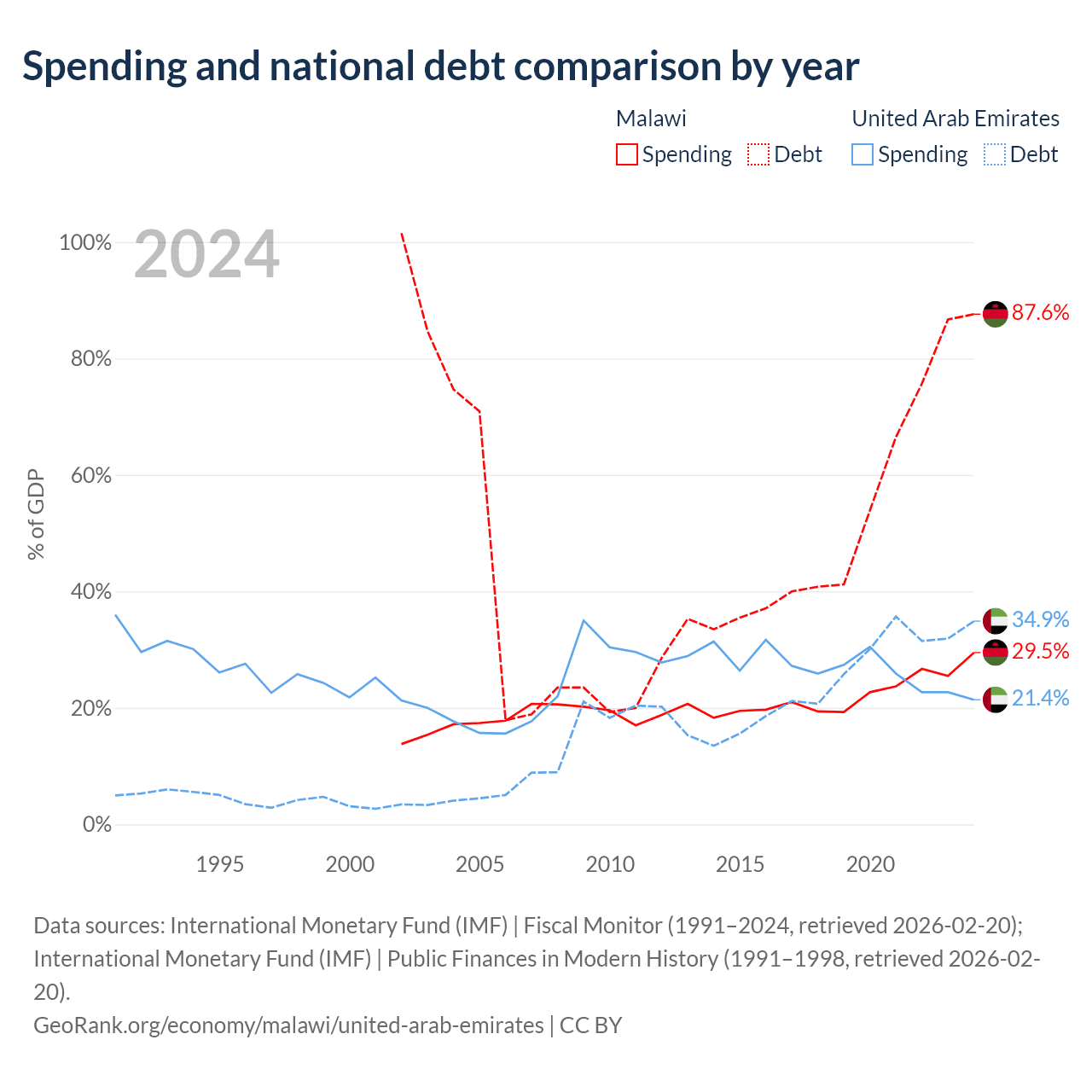 Malawi has $9.91B in government debt (87.6% of GDP), compared to $193B (34.9% of GDP) in the United Arab Emirates.