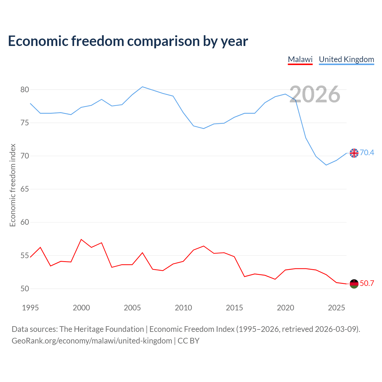 The Economic Freedom Index for Malawi is 50.7, ranking 159/197, compared to 70.4 for the United Kingdom, ranking 35/197. The chart above displays a comparison of annual changes in economic freedom indexes.