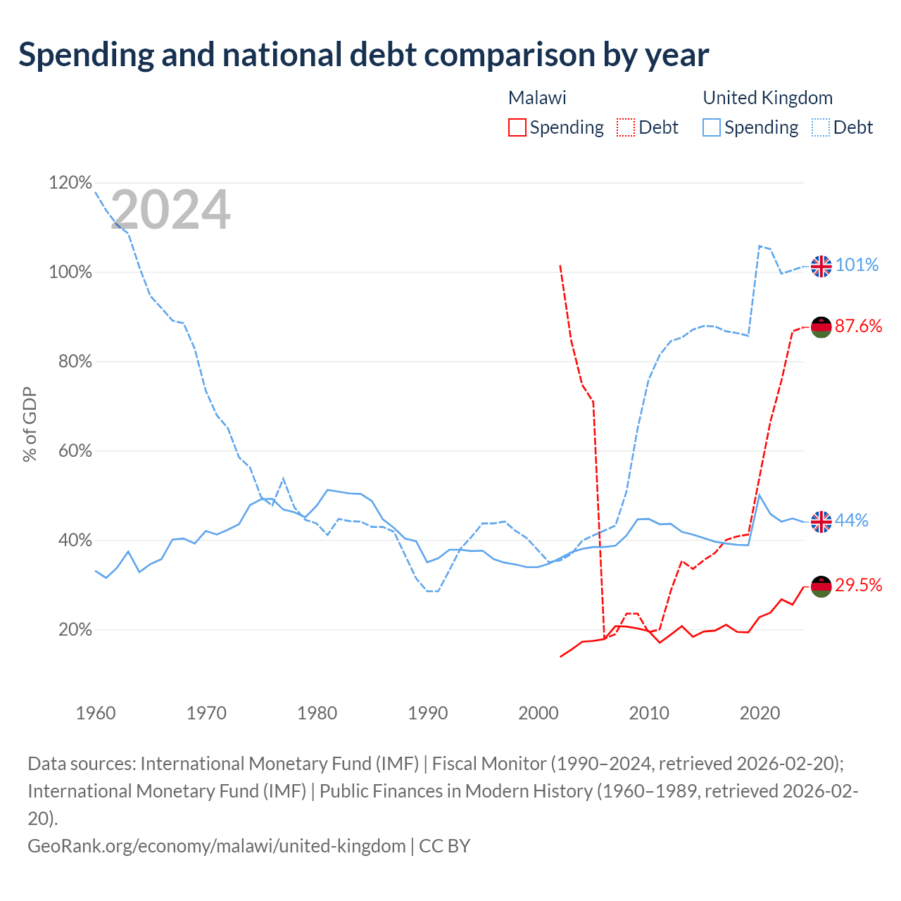 Malawi has $9.91B in government debt (87.6% of GDP), compared to $3.73T (101.2% of GDP) in the United Kingdom.
