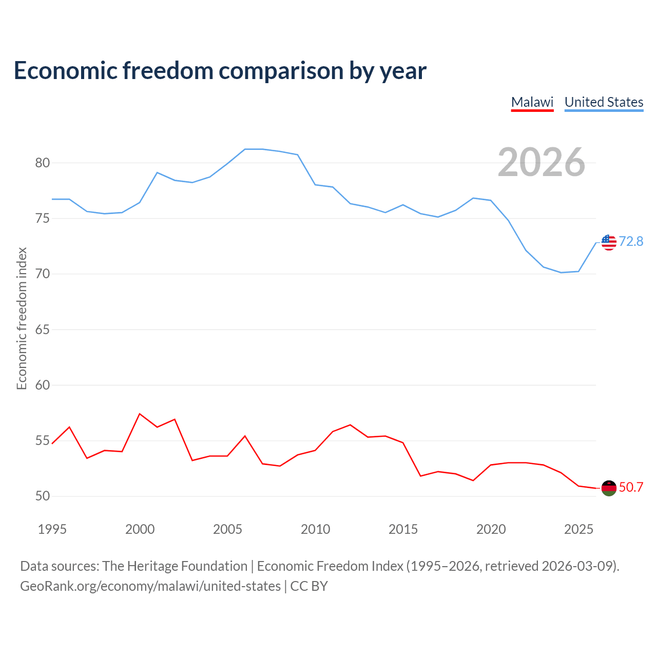 The Economic Freedom Index for Malawi is 50.7, ranking 159/197, compared to 72.8 for the United States, ranking 27/197. The chart above displays a comparison of annual changes in economic freedom indexes.