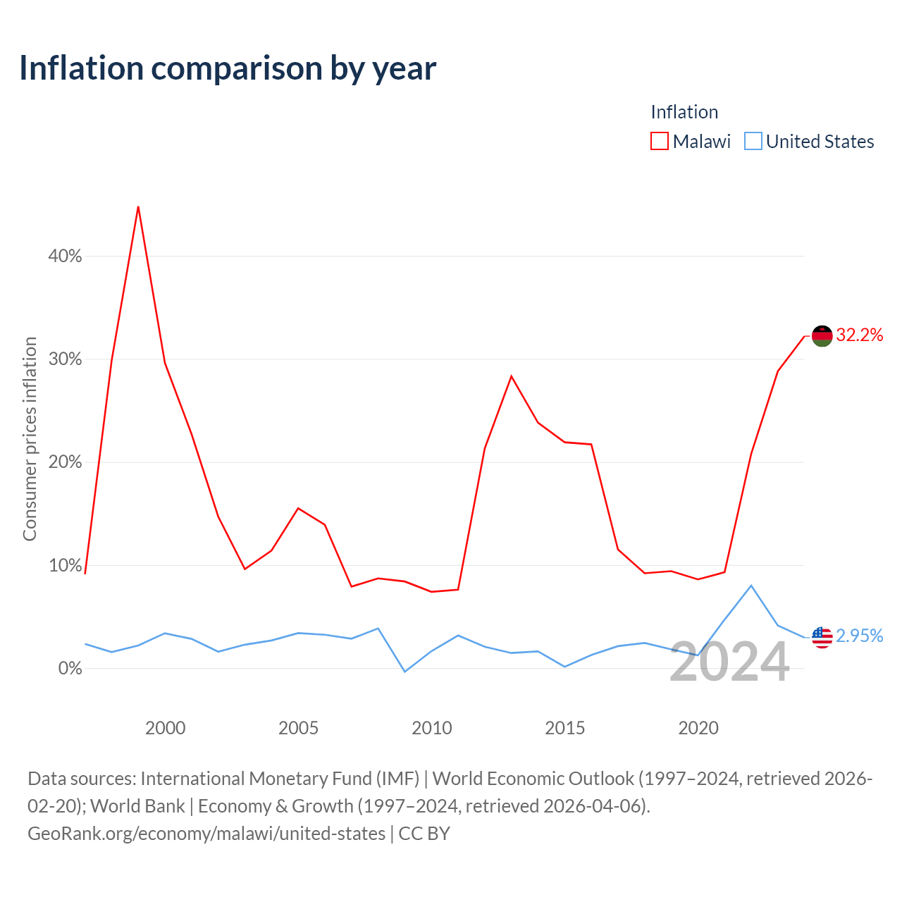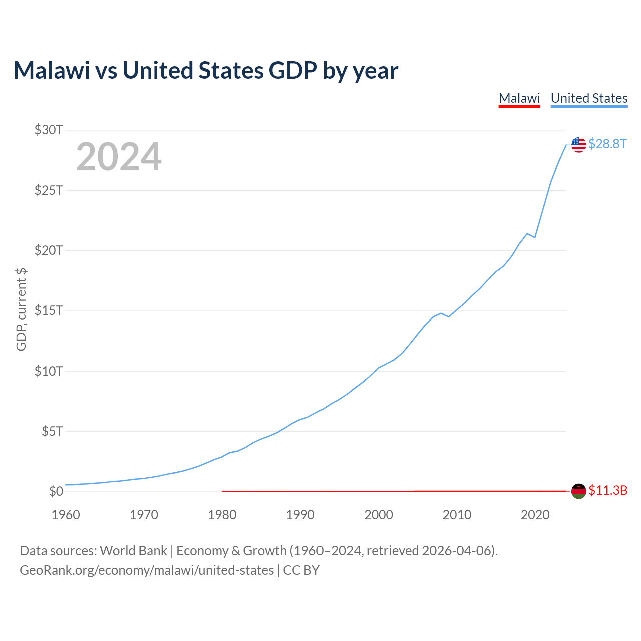 Malawi has a GDP of $11.3B compared to $28.8T for the United States, ranking 151/197 and 1/197 by economy size, respectively.