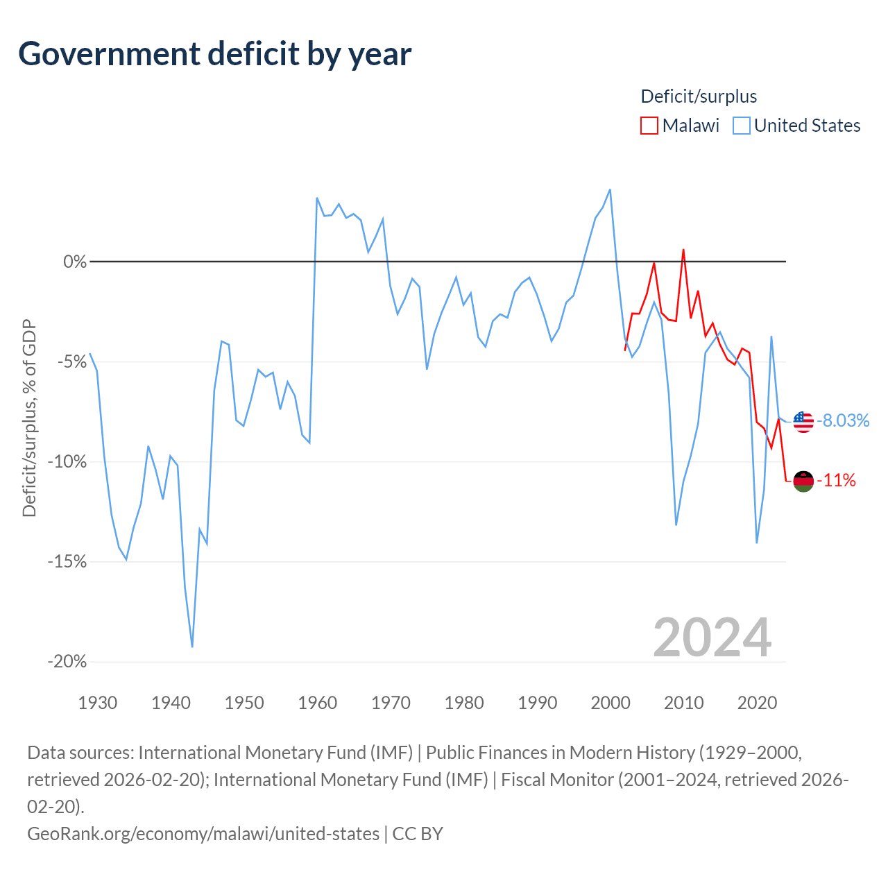 Malawi has $9.91B in government debt (87.6% of GDP), compared to $35.2T (122.3% of GDP) in the United States.