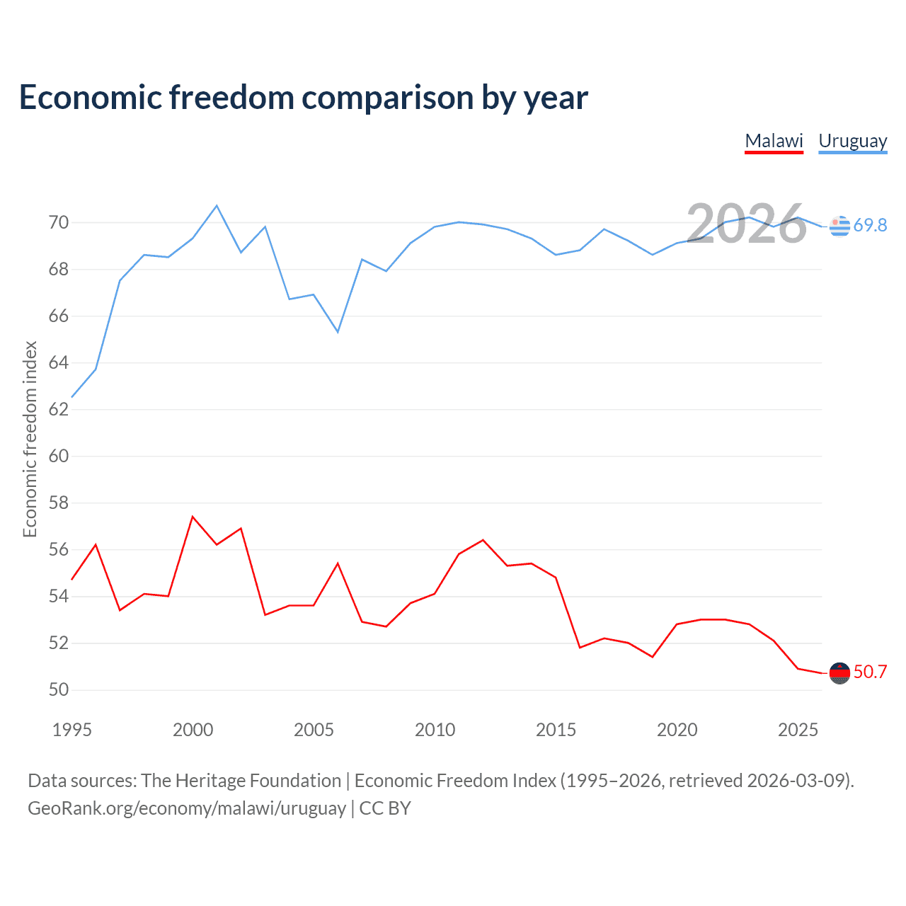 The Economic Freedom Index for Malawi is 50.7, ranking 159/197, compared to 69.8 for Uruguay, ranking 39/197. The chart above displays a comparison of annual changes in economic freedom indexes.
