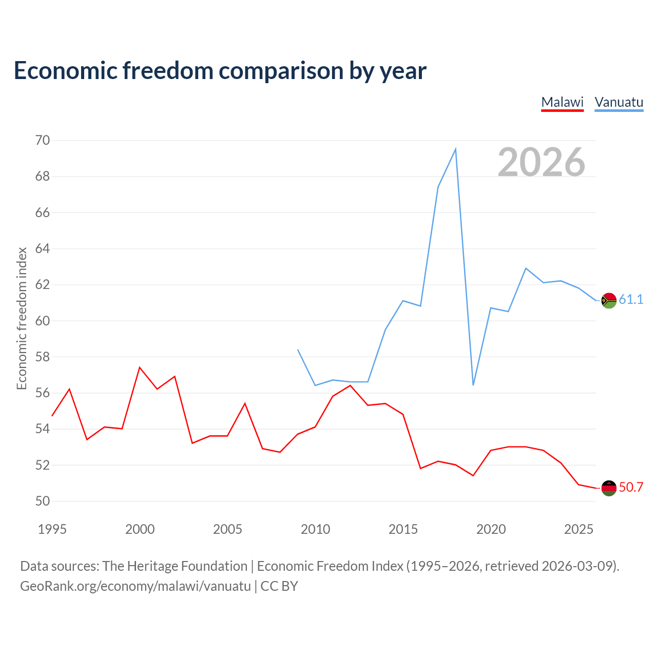 The Economic Freedom Index for Malawi is 50.7, ranking 159/197, compared to 61.1 for Vanuatu, ranking 92/197. The chart above displays a comparison of annual changes in economic freedom indexes.