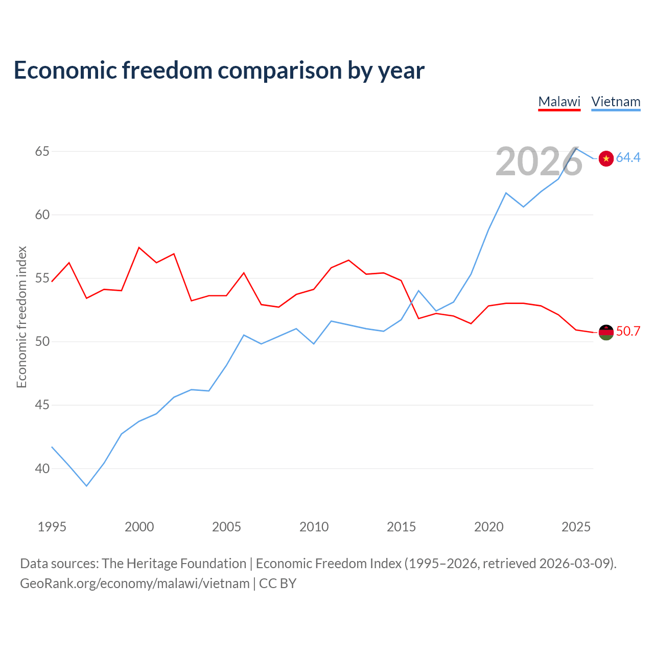 The Economic Freedom Index for Malawi is 50.7, ranking 159/197, compared to 64.4 for Vietnam, ranking 73/197. The chart above displays a comparison of annual changes in economic freedom indexes.