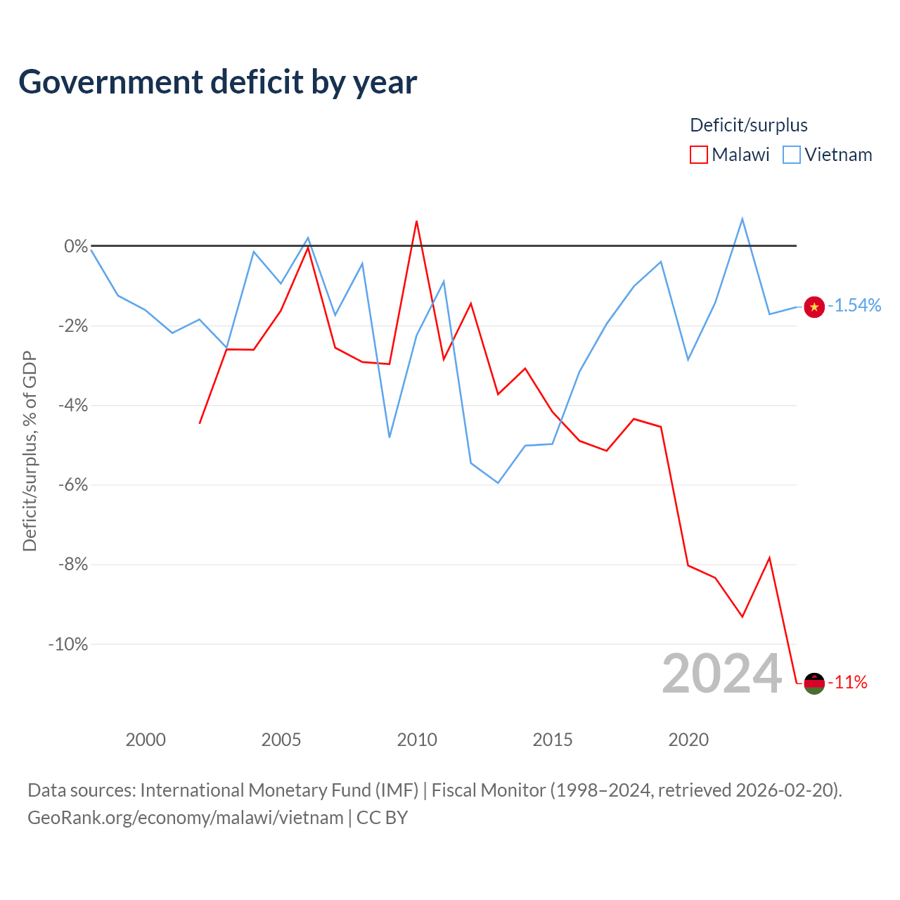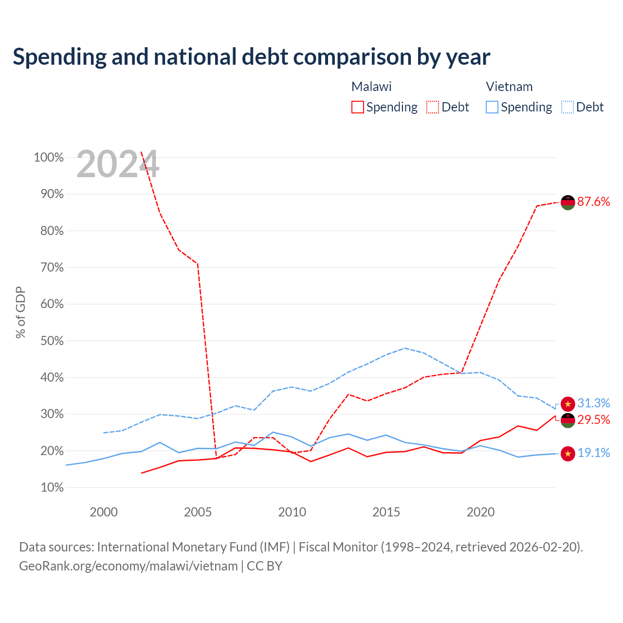 Malawi has $9.91B in government debt (87.6% of GDP), compared to $149B (31.3% of GDP) in Vietnam.