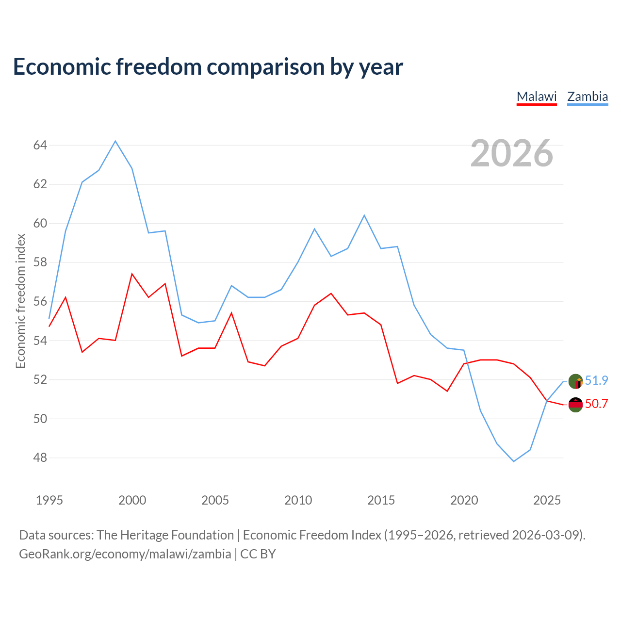 The Economic Freedom Index for Malawi is 50.7, ranking 159/197, compared to 51.9 for Zambia, ranking 152/197. The chart above displays a comparison of annual changes in economic freedom indexes.