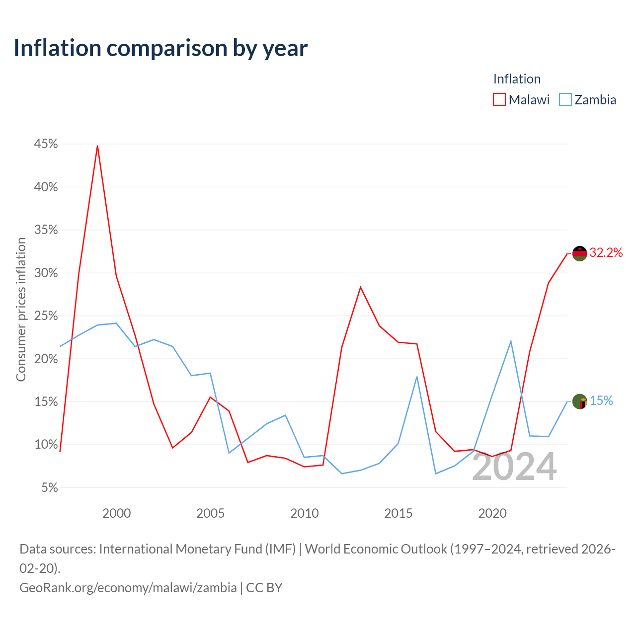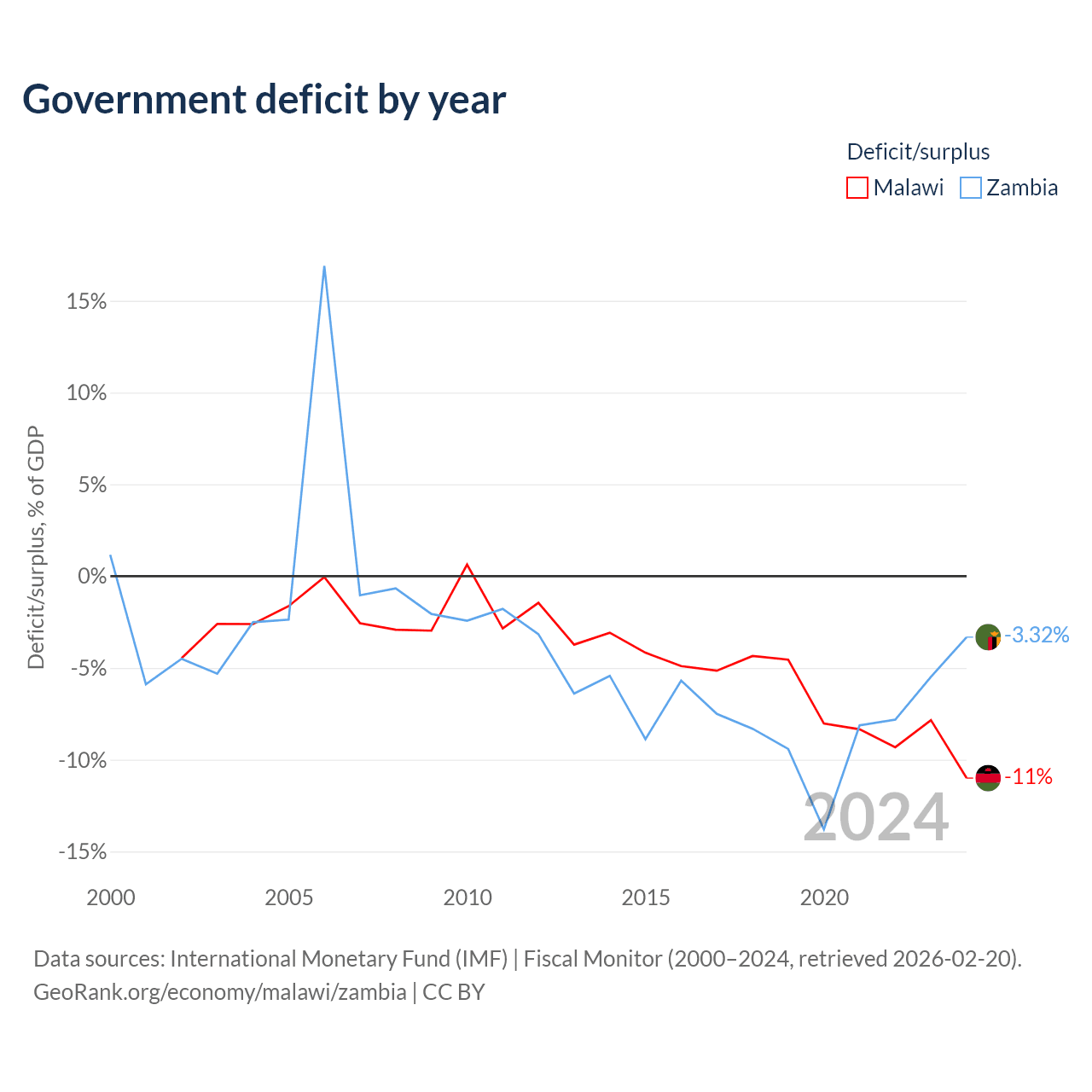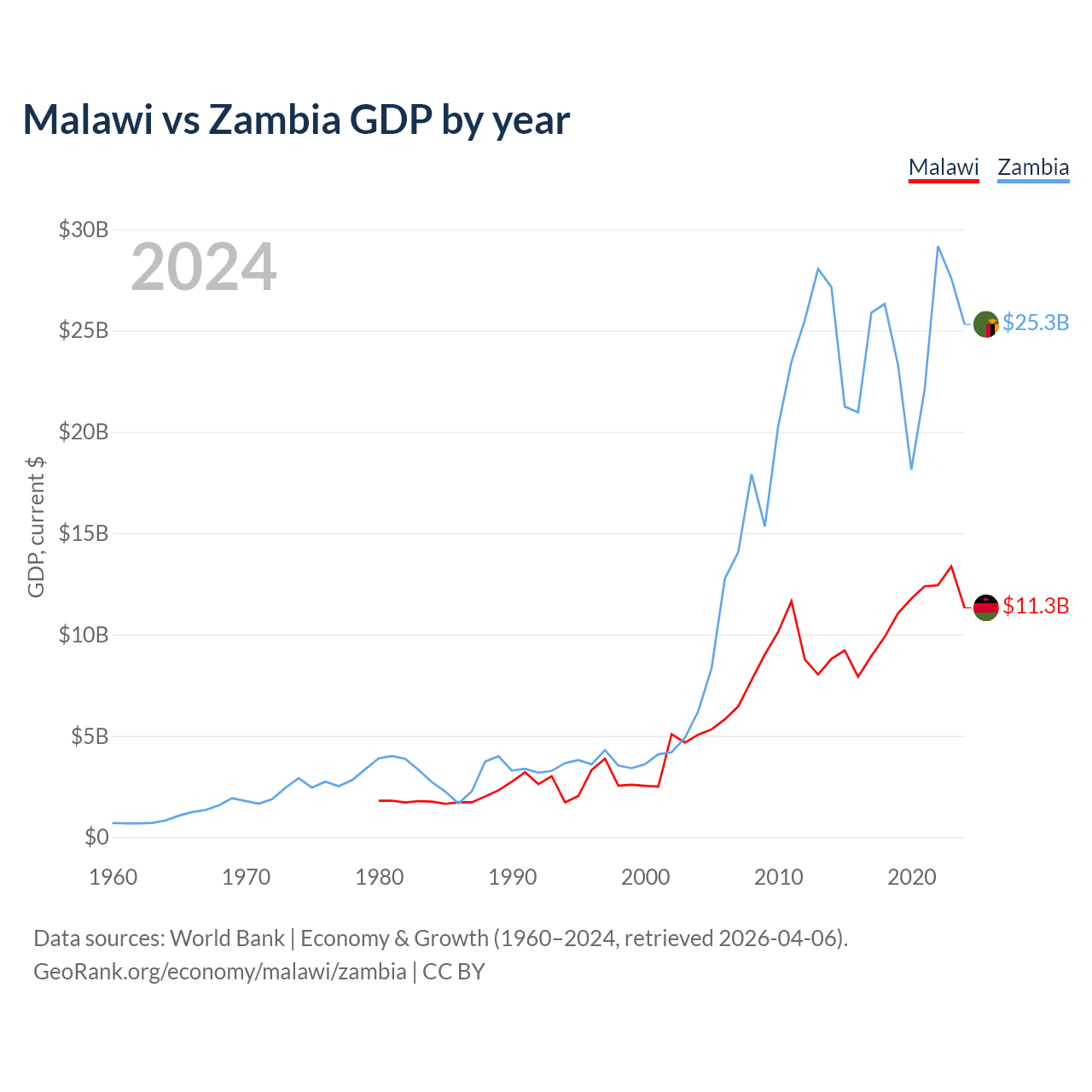 Malawi has a GDP of $11.3B compared to $25.3B for Zambia, ranking 151/197 and 116/197 by economy size, respectively.