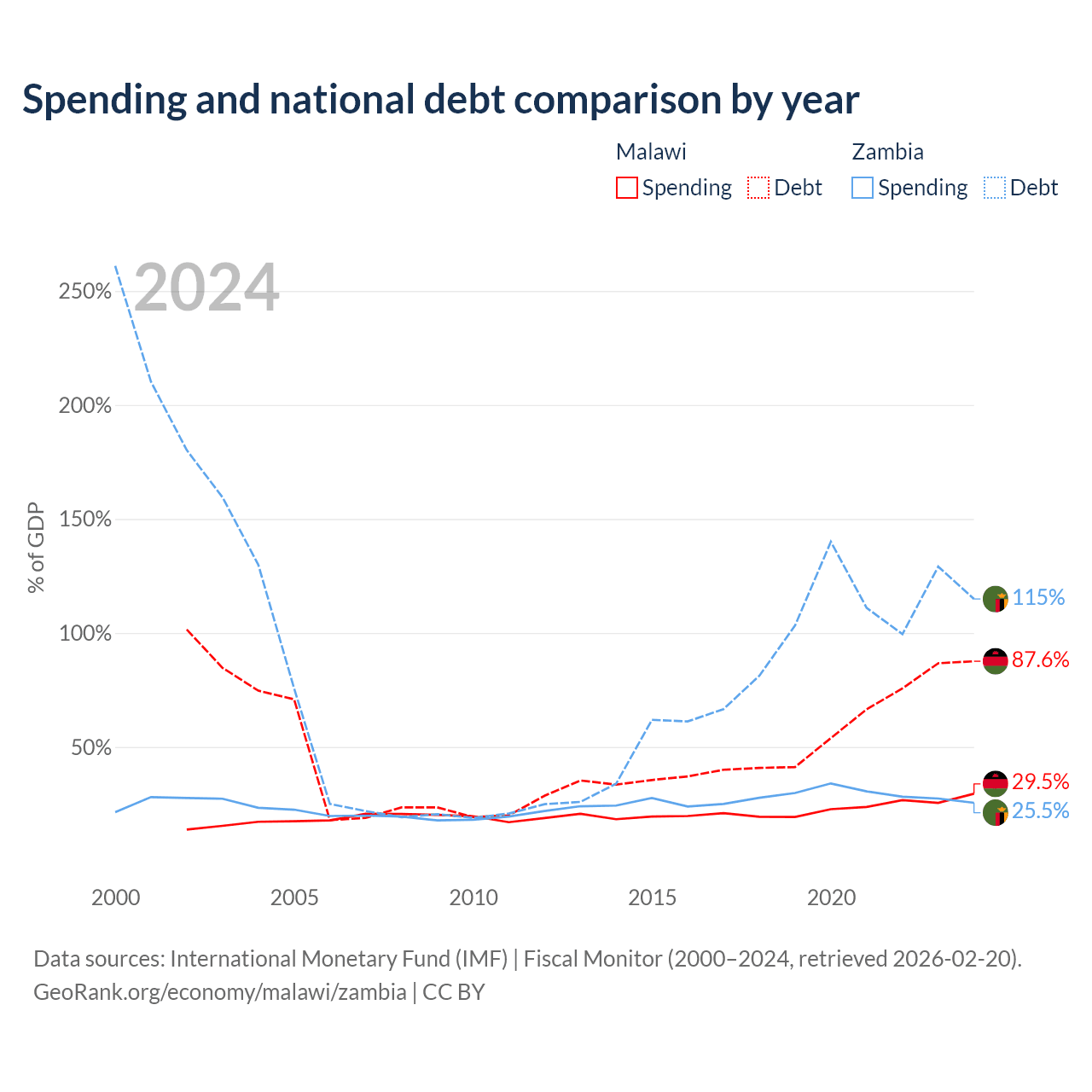 Malawi has $9.91B in government debt (87.6% of GDP), compared to $29.1B (114.9% of GDP) in Zambia.