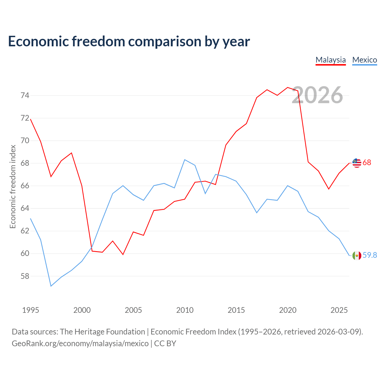 The Economic Freedom Index for Malaysia is 68, ranking 51/197, compared to 59.8 for Mexico, ranking 102/197. The chart above displays a comparison of annual changes in economic freedom indexes.