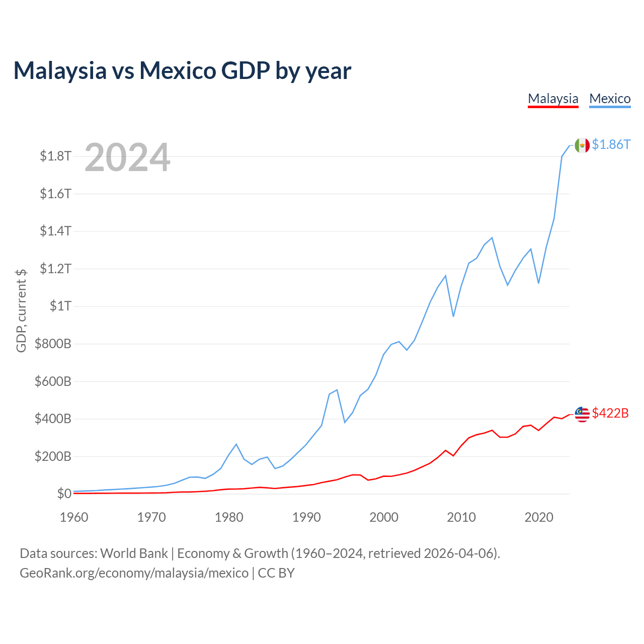 Malaysia has a GDP of $422B compared to $1.86T for Mexico, ranking 38/197 and 13/197 by economy size, respectively.