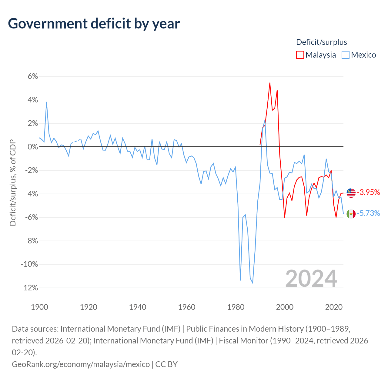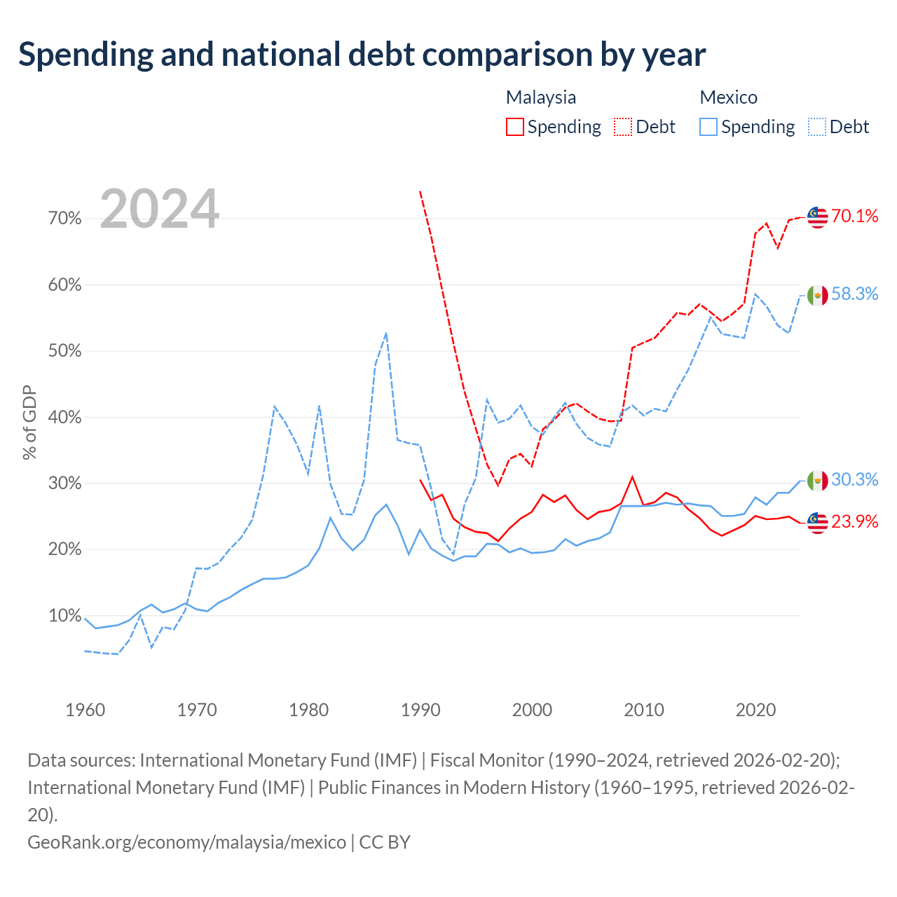 Malaysia has $296B in government debt (70.1% of GDP), compared to $1.08T (58.3% of GDP) in Mexico.