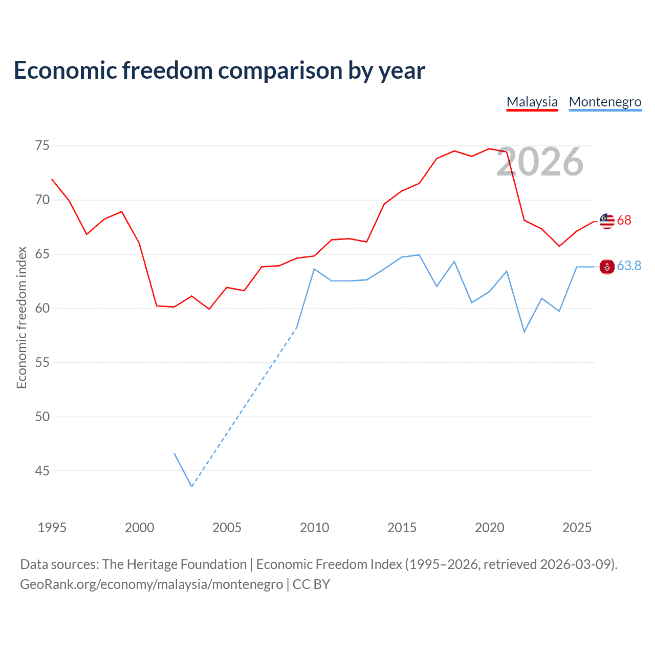 The Economic Freedom Index for Malaysia is 68, ranking 51/197, compared to 63.8 for Montenegro, ranking 78/197. The chart above displays a comparison of annual changes in economic freedom indexes.