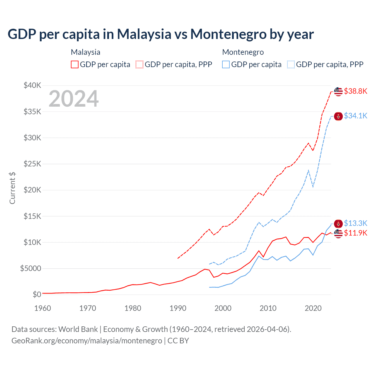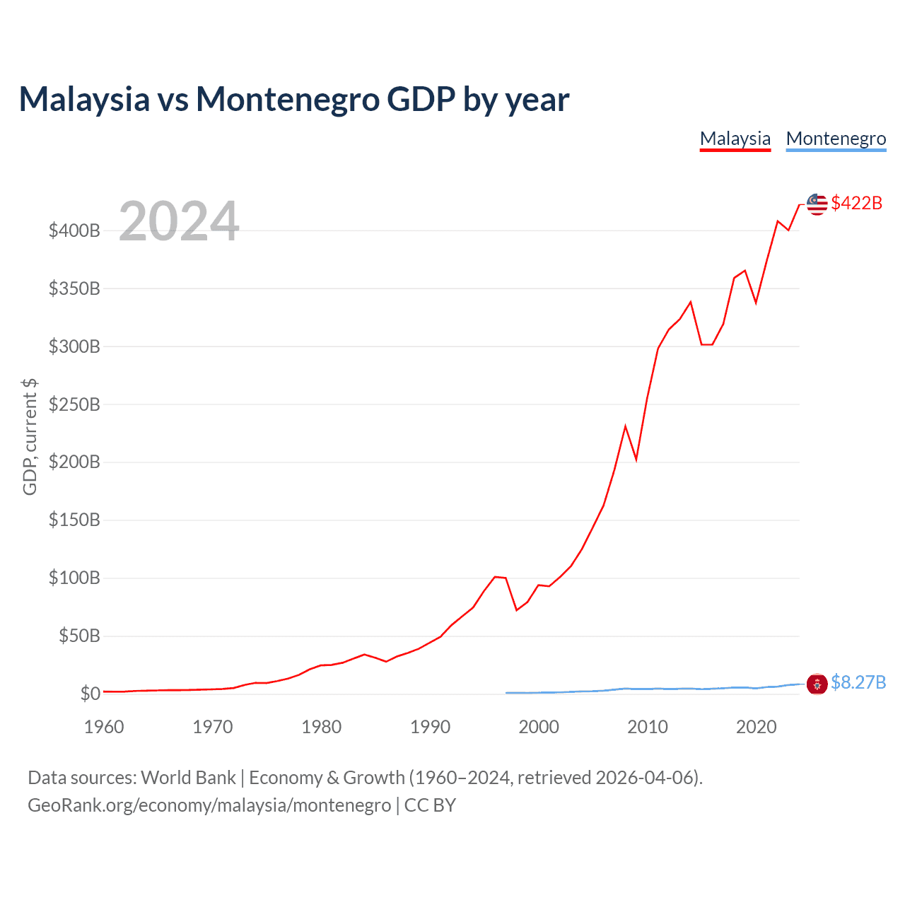 Malaysia has a GDP of $422B compared to $8.27B for Montenegro, ranking 38/197 and 155/197 by economy size, respectively.