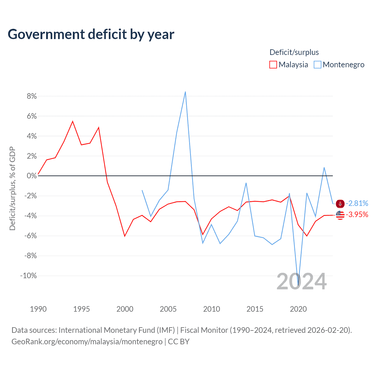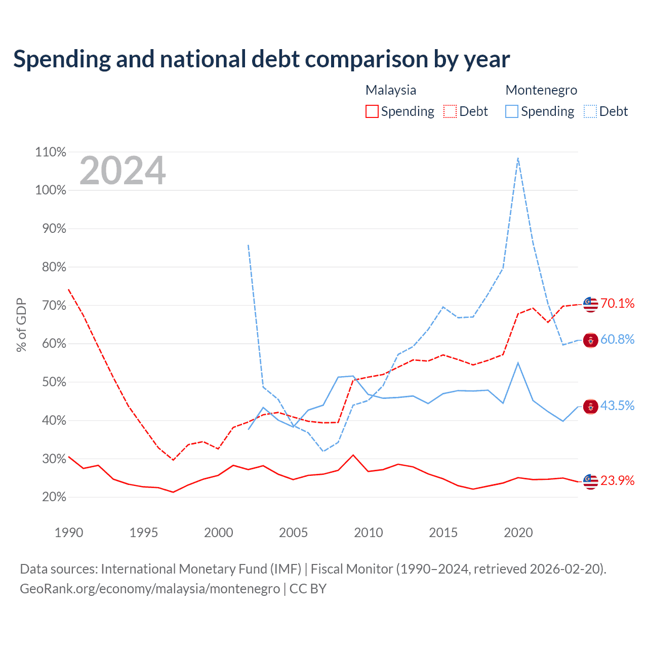 Malaysia has $296B in government debt (70.1% of GDP), compared to $5.02B (60.8% of GDP) in Montenegro.