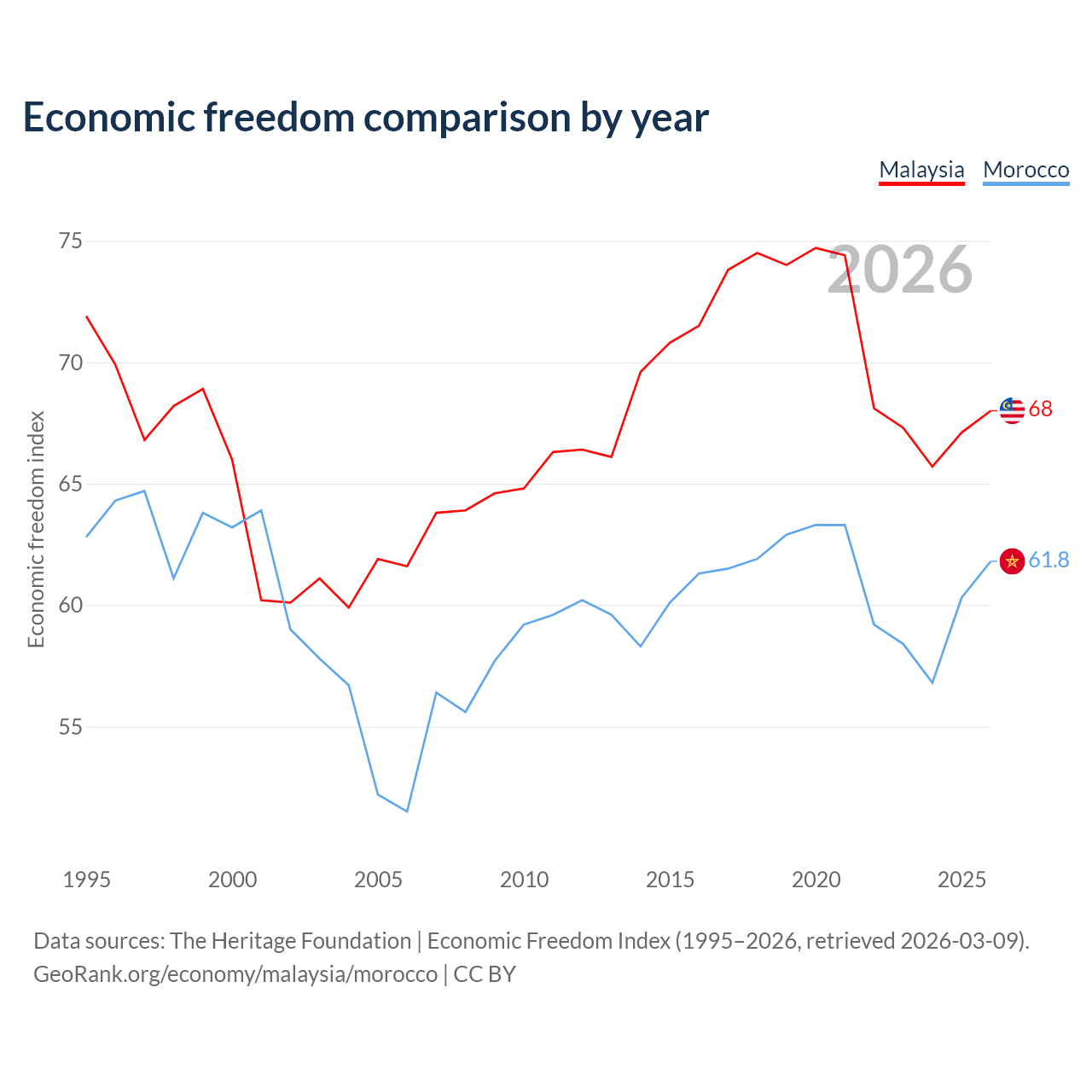 The Economic Freedom Index for Malaysia is 68, ranking 51/197, compared to 61.8 for Morocco, ranking 91/197. The chart above displays a comparison of annual changes in economic freedom indexes.
