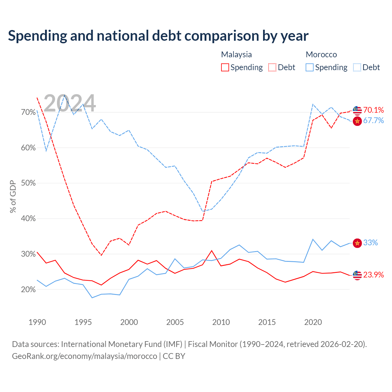 Malaysia has $296B in government debt (70.1% of GDP), compared to $109B (67.7% of GDP) in Morocco.