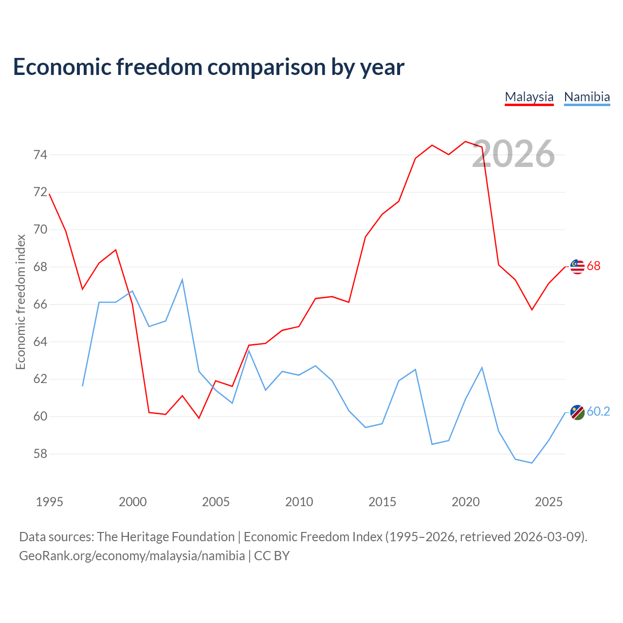 The Economic Freedom Index for Malaysia is 68, ranking 51/197, compared to 60.2 for Namibia, ranking 95/197. The chart above displays a comparison of annual changes in economic freedom indexes.