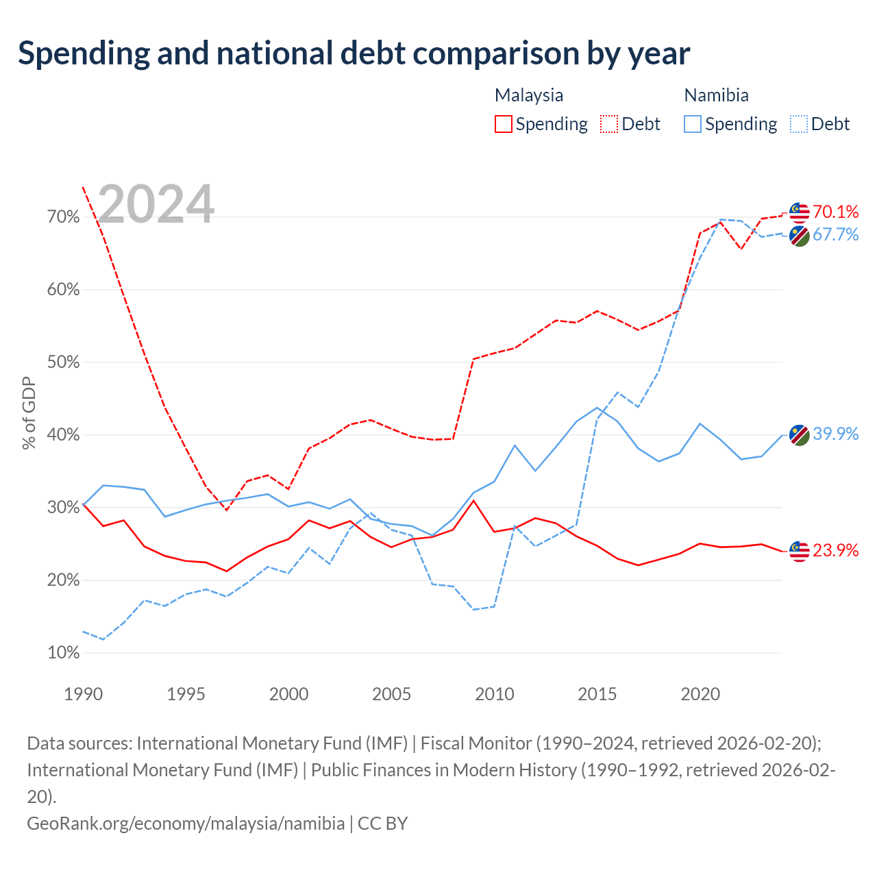Malaysia has $296B in government debt (70.1% of GDP), compared to $9.05B (67.7% of GDP) in Namibia.