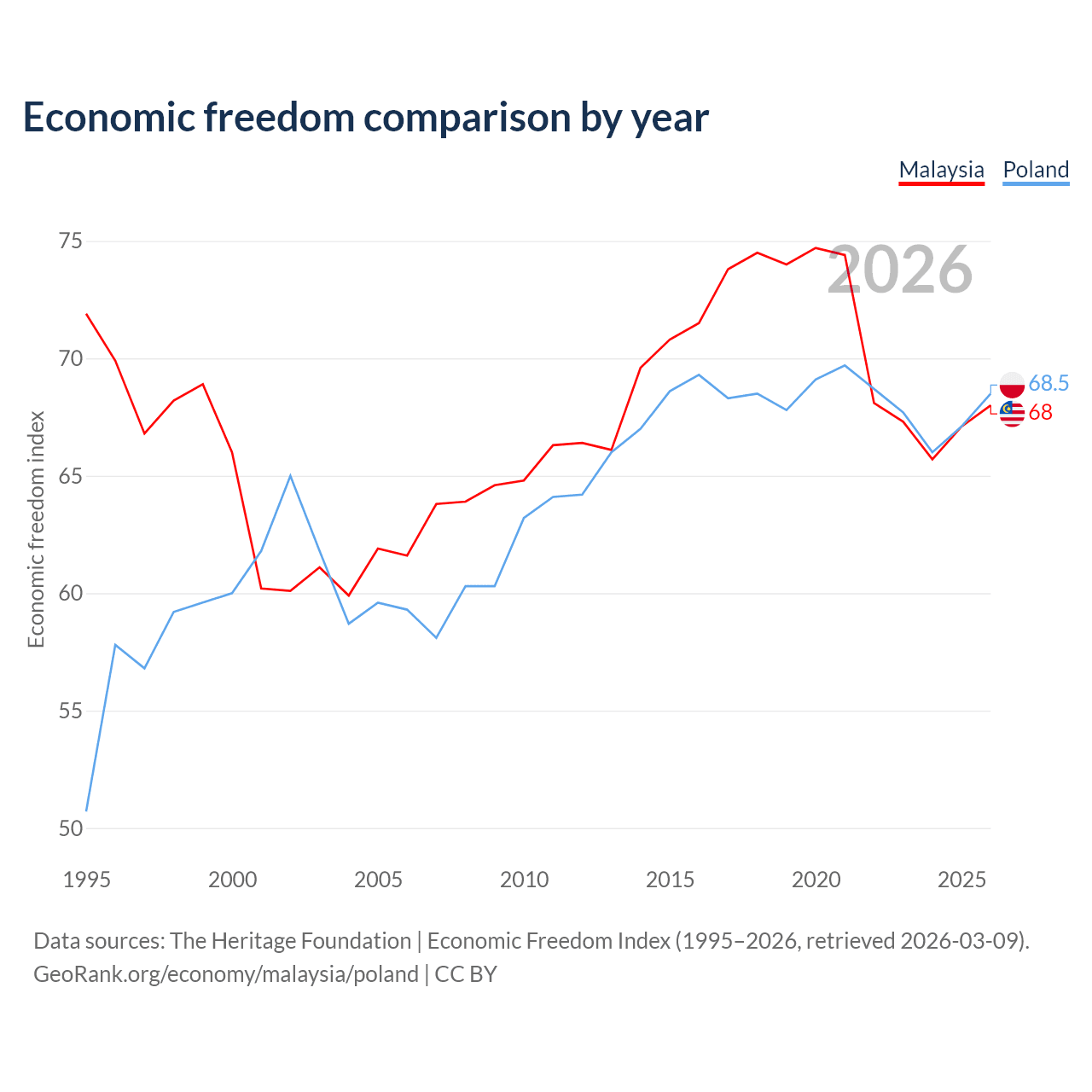 The Economic Freedom Index for Malaysia is 68, ranking 51/197, compared to 68.5 for Poland, ranking 46/197. The chart above displays a comparison of annual changes in economic freedom indexes.