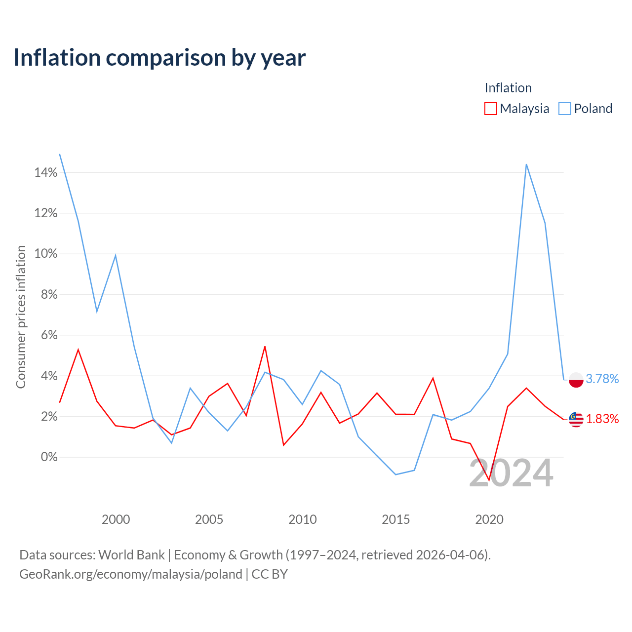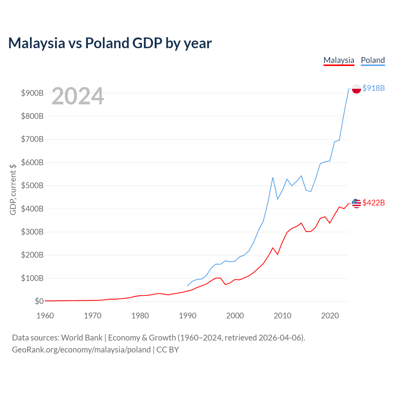 Malaysia has a GDP of $422B compared to $918B for Poland, ranking 38/197 and 21/197 by economy size, respectively.