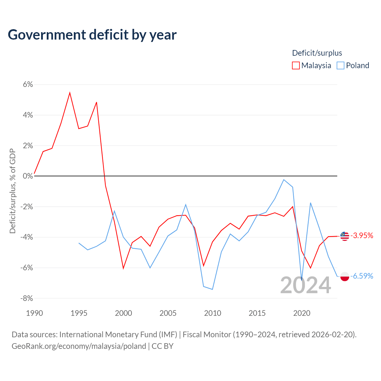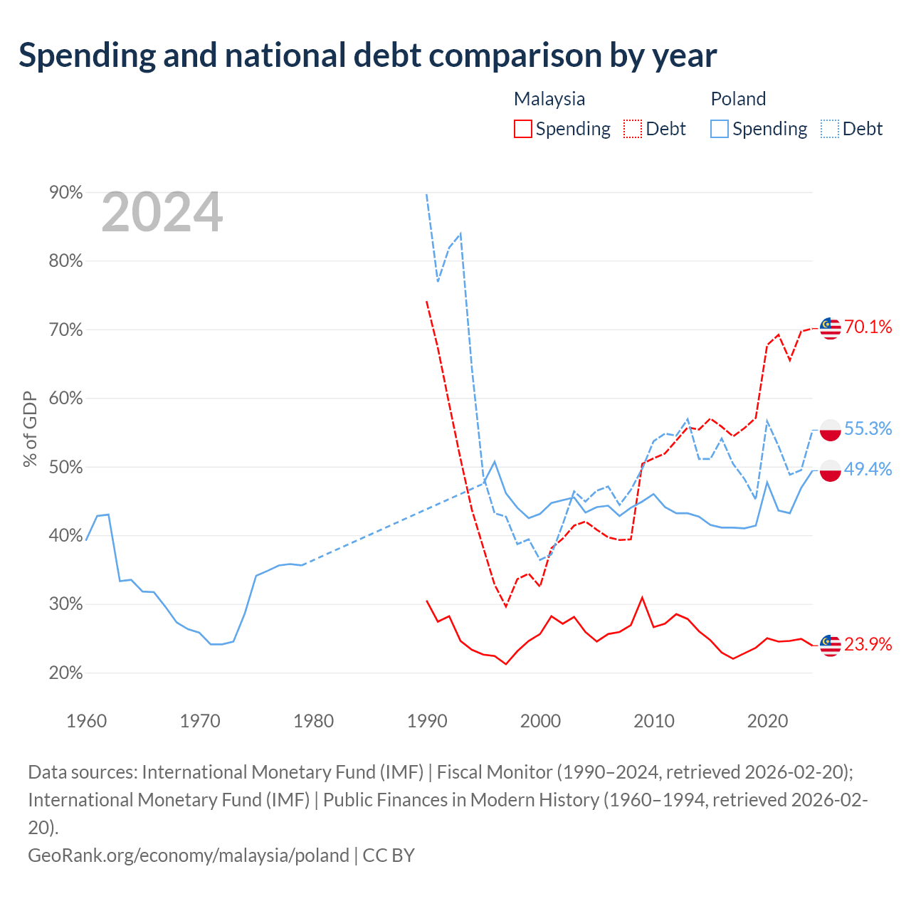 Malaysia has $296B in government debt (70.1% of GDP), compared to $507B (55.3% of GDP) in Poland.